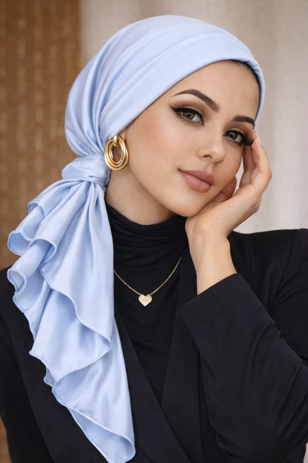 The mini tie detail is connected with a soft scrunchy, allowing the turban to sit perfectly without slipping or tightening. It creates a graceful drape at the back while keeping the front clean and structured.