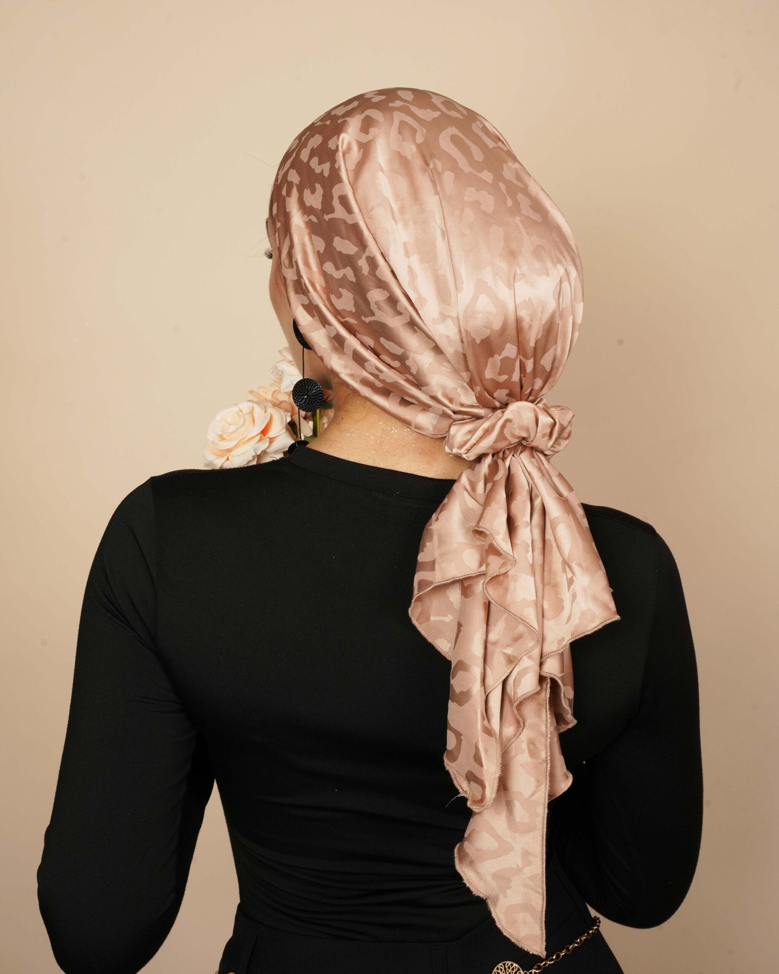 Satin silk mini tie turban with a soft  leopard print, featuring a built-in inner cotton turban and a mini tie back for a smooth, comfortable, and secure fit