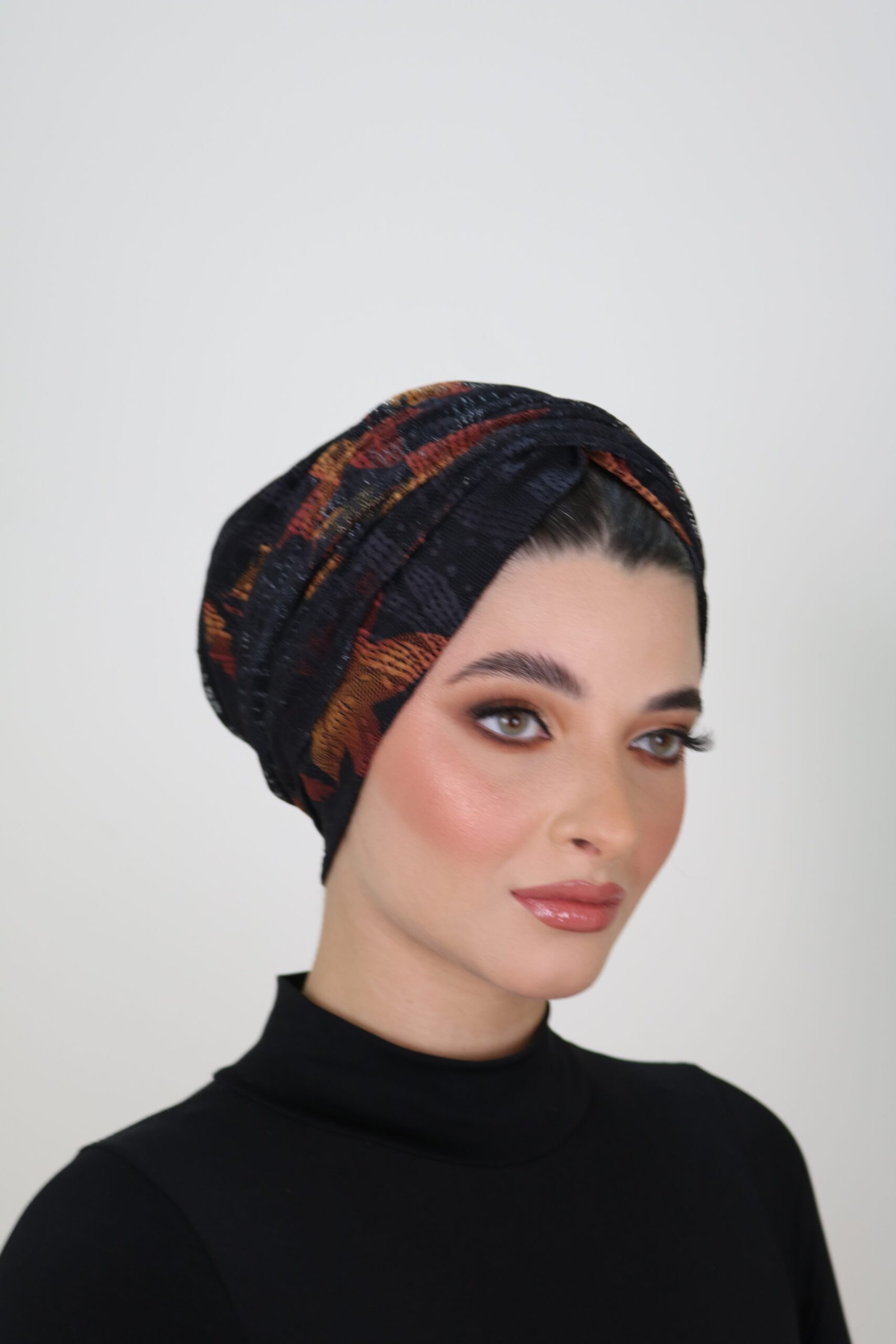 Designed as a two-piece Zam Drape linked from the back, this style includes a smooth inner base and a loose front drape that falls naturally into soft, face-framing folds. The Black Autumn pattern adds depth and richness without overpowering the look.