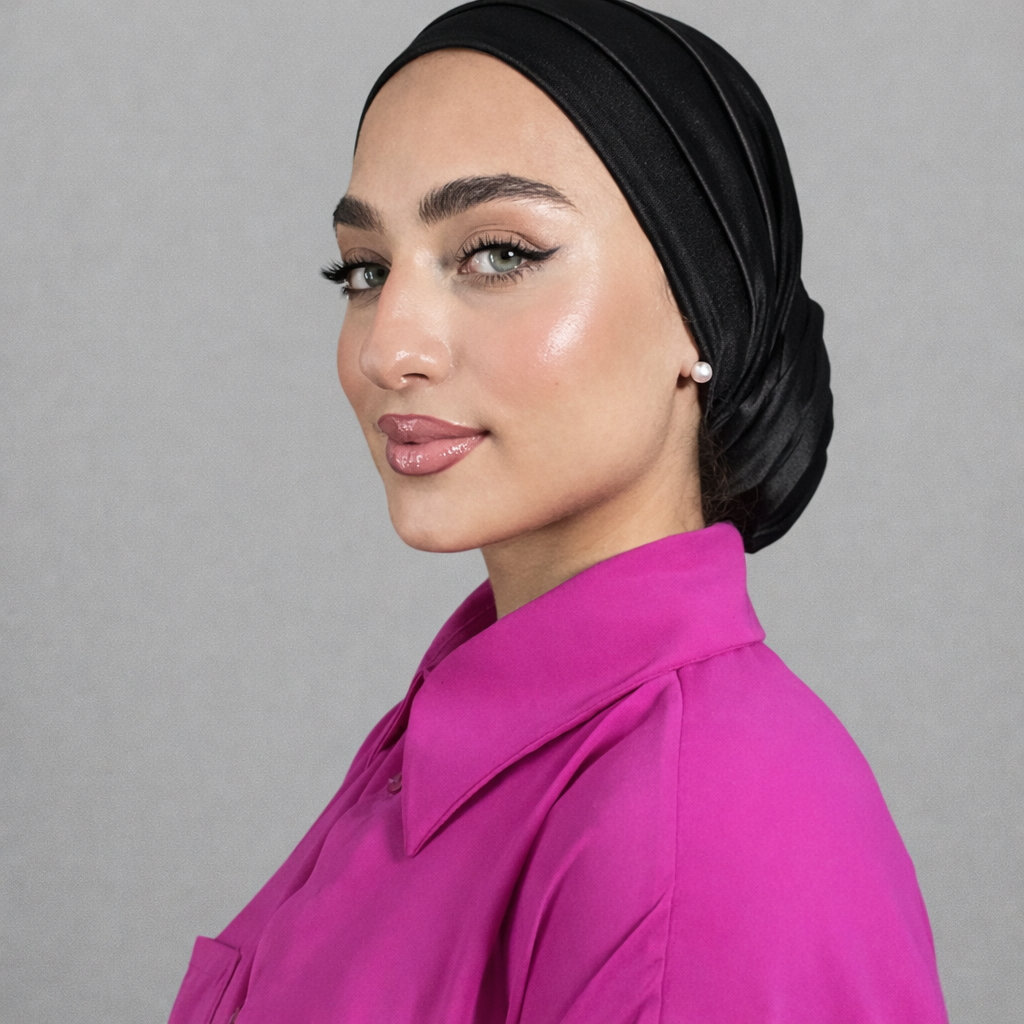 This satin lycra drape bun turban is designed to create a smooth, styled look with a soft, flowing drape at the back. Crafted from satin-finish lycra, it combines gentle shine with stretch comfort, allowing the turban to sit securely while maintaining a refined appearance.