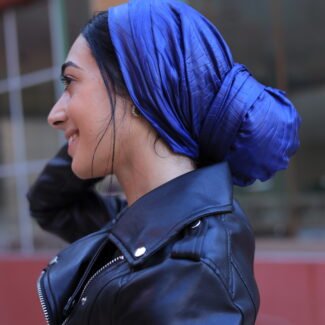 This turban is crafted from Leather Lycra, featuring a smooth leather-look surface combined with a soft, flexible lycra base. The fabric offers gentle stretch for comfort while maintaining a clean, structured drape.