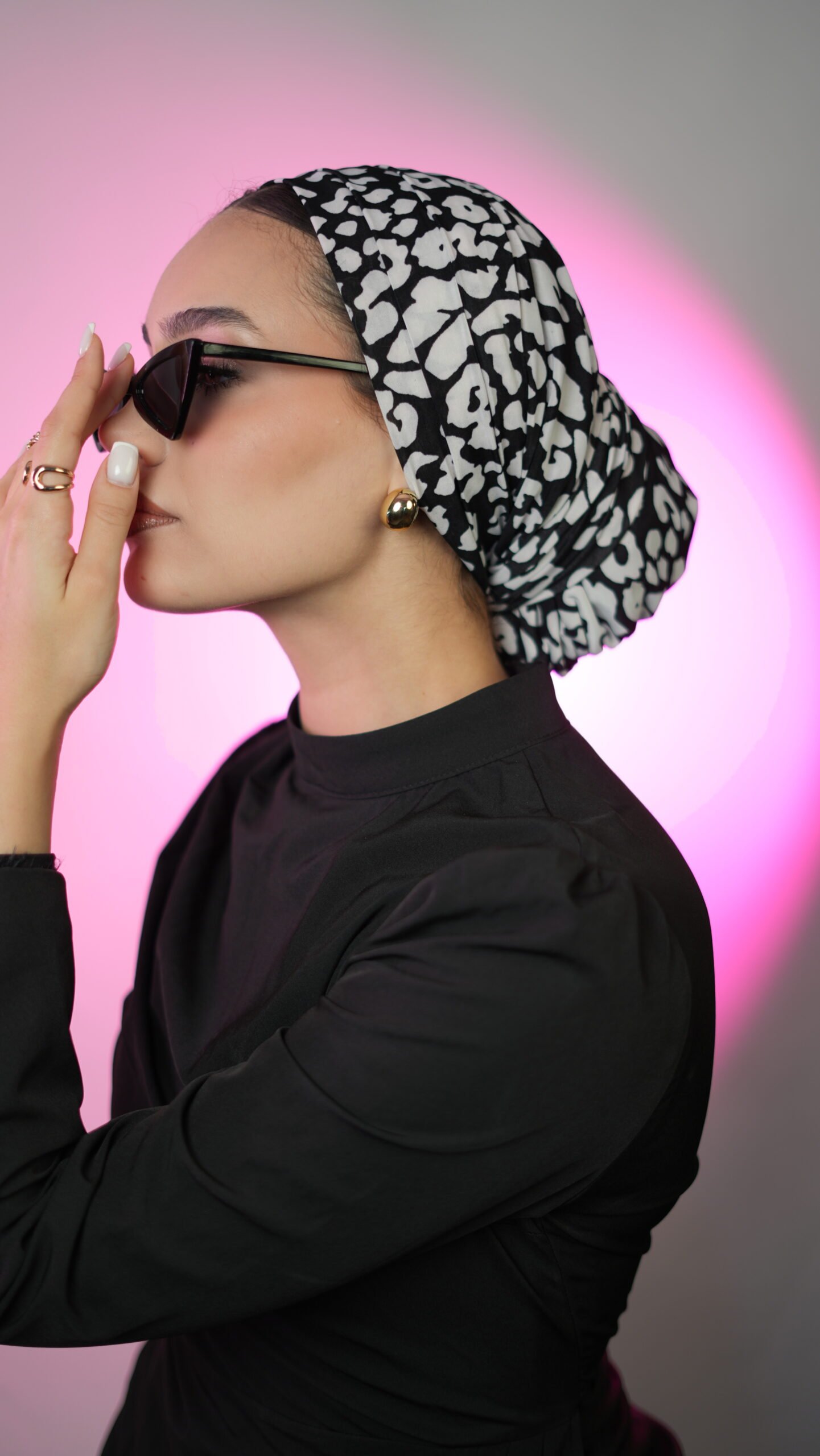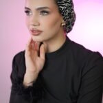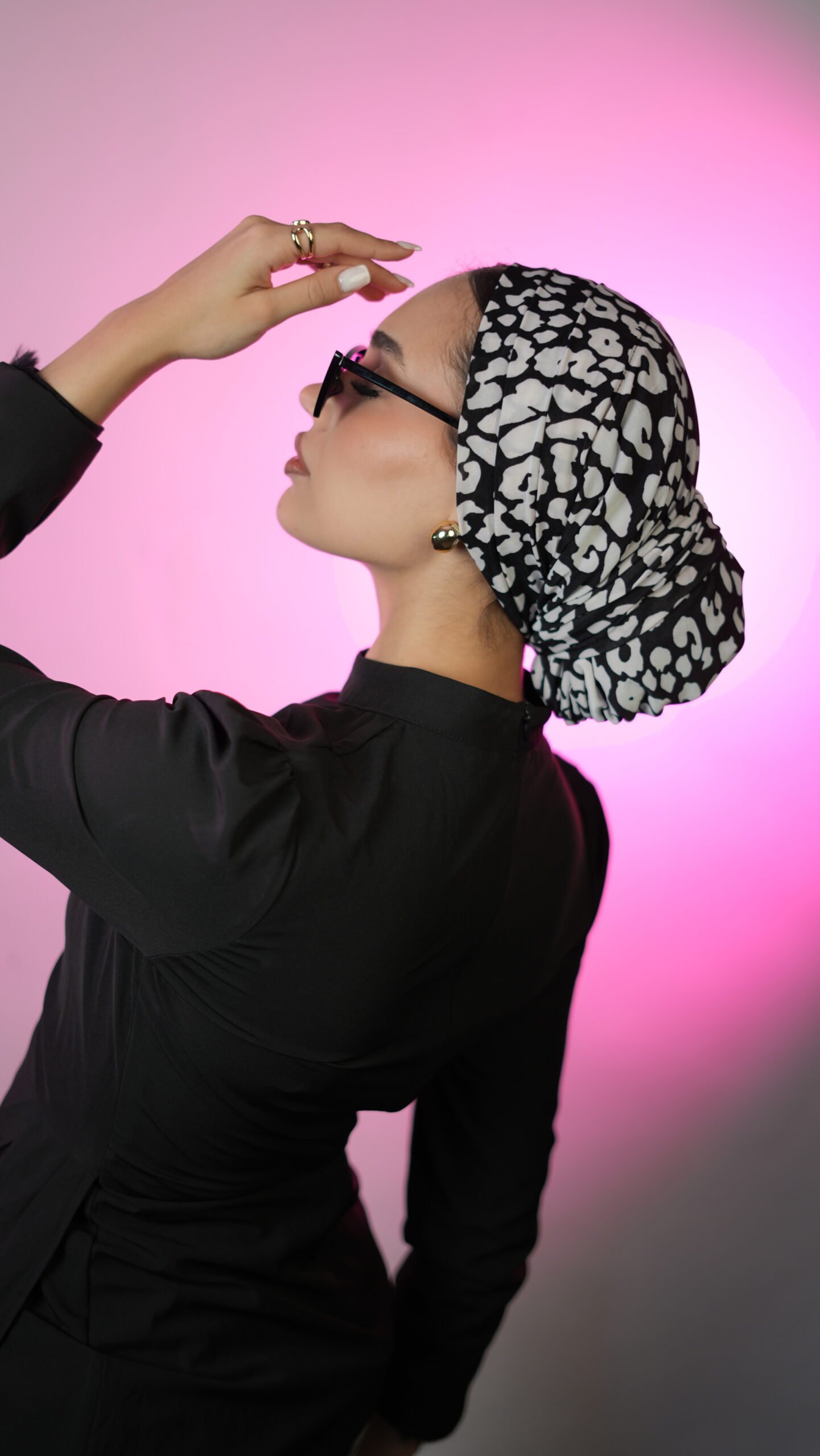 The Mono Leopard Drape Bun is a one-piece turban designed with a clean front and a softly wrapped bun at the back. Made from a lightweight, soft fabric, it features a bold black leopard print on an ivory base, creating a striking yet balanced look.