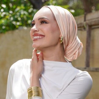 Made from leather-effect lycra, the fabric has a smooth surface with a subtle sheen and a soft stretch base for comfortable, secure wear. Lightweight yet structured, this turban offers flexibility while maintaining a polished appearance.