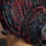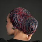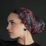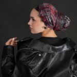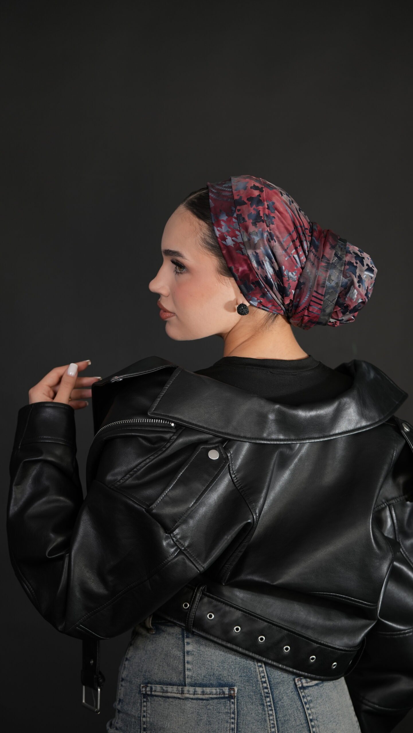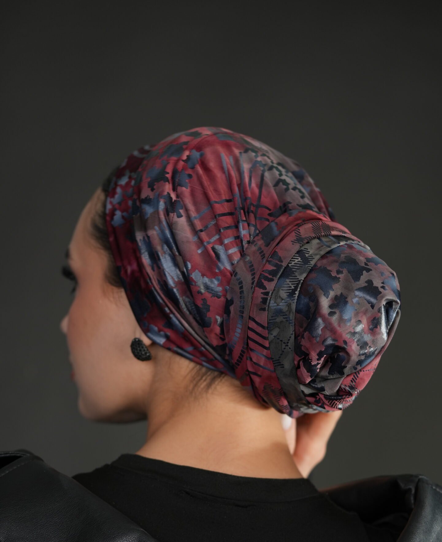 The Burgundy Eclipse Leather-Effect Lycra Turban features a deep blend of burgundy, , and dark neutral tones, creating a balanced print that works effortlessly with a wide range of looks.