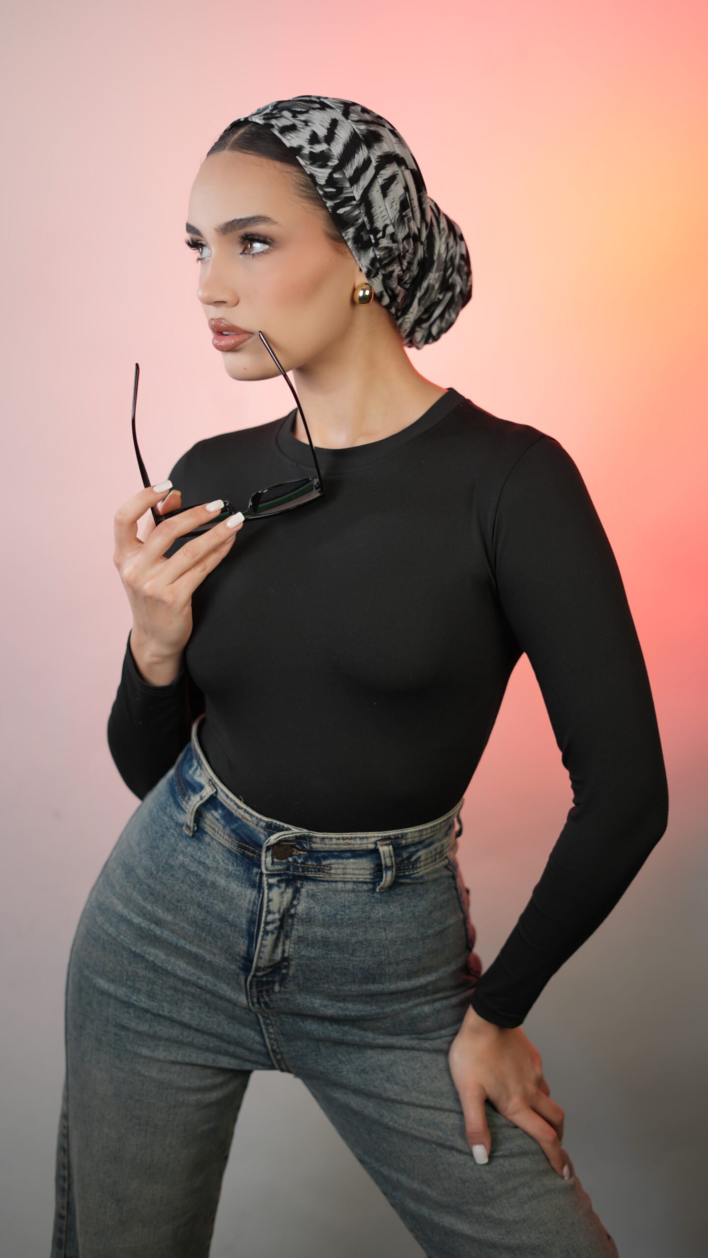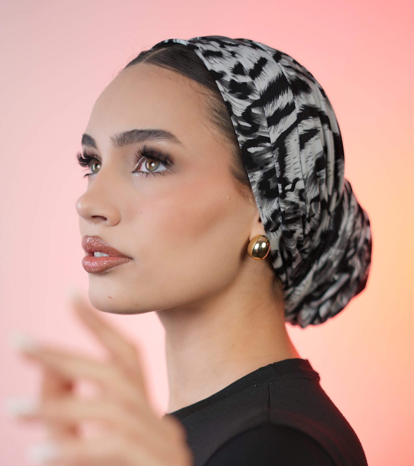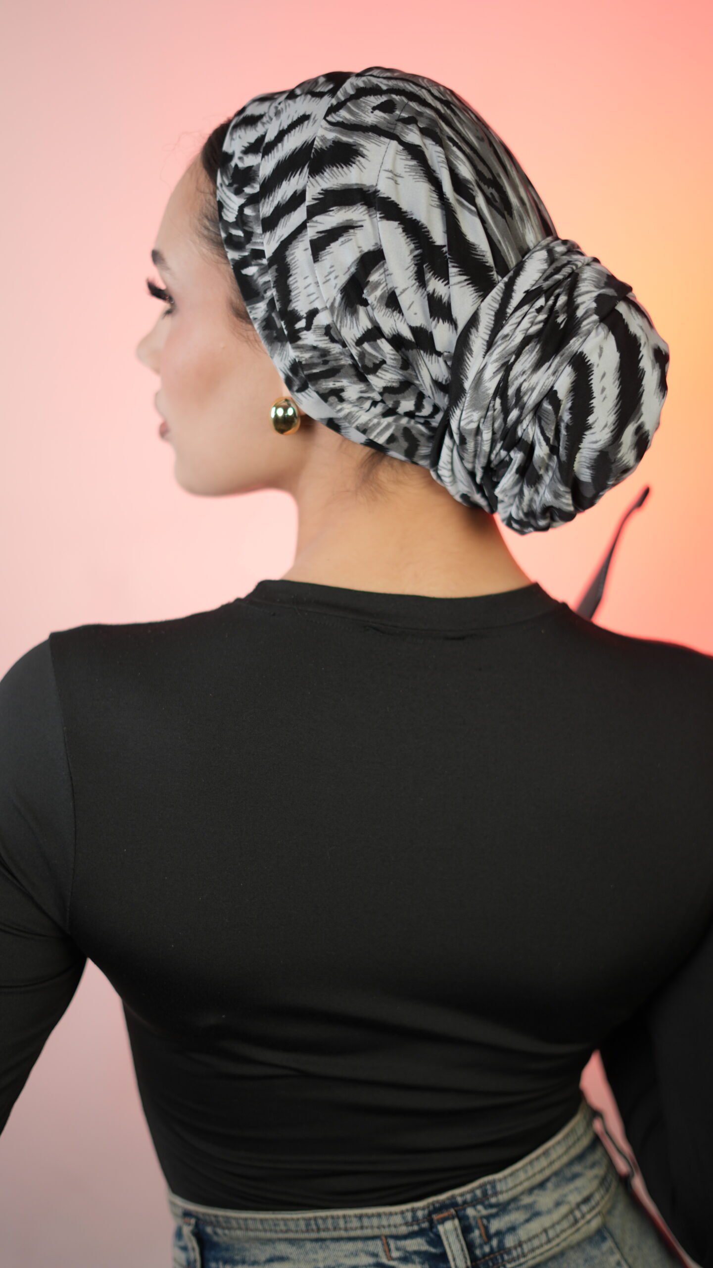 The Zebra Leopard Drape Bun is a one-piece turban designed with a clean front and a softly wrapped bun at the back. Made from a lightweight, soft fabric, it features a zebra–leopard inspired abstract print, blending fluid lines with a bold, modern look.