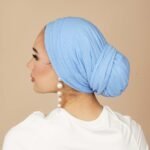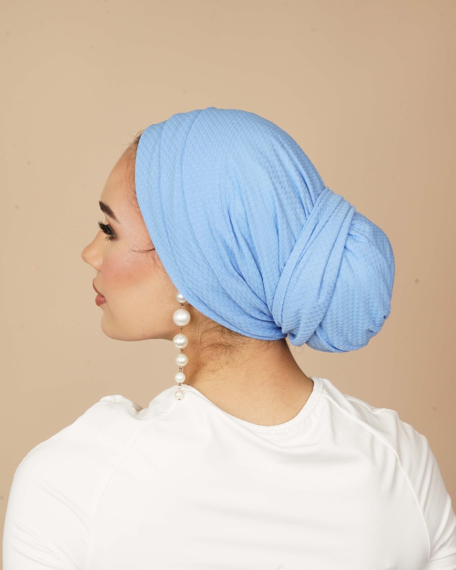 The Cloud Grey Drape Bun is a one-piece turban designed with a smooth, clean front and a softly wrapped bun at the back. Made from a waffle-texture fabric, it highlights a defined texture that adds depth and natural volume without feeling heavy.