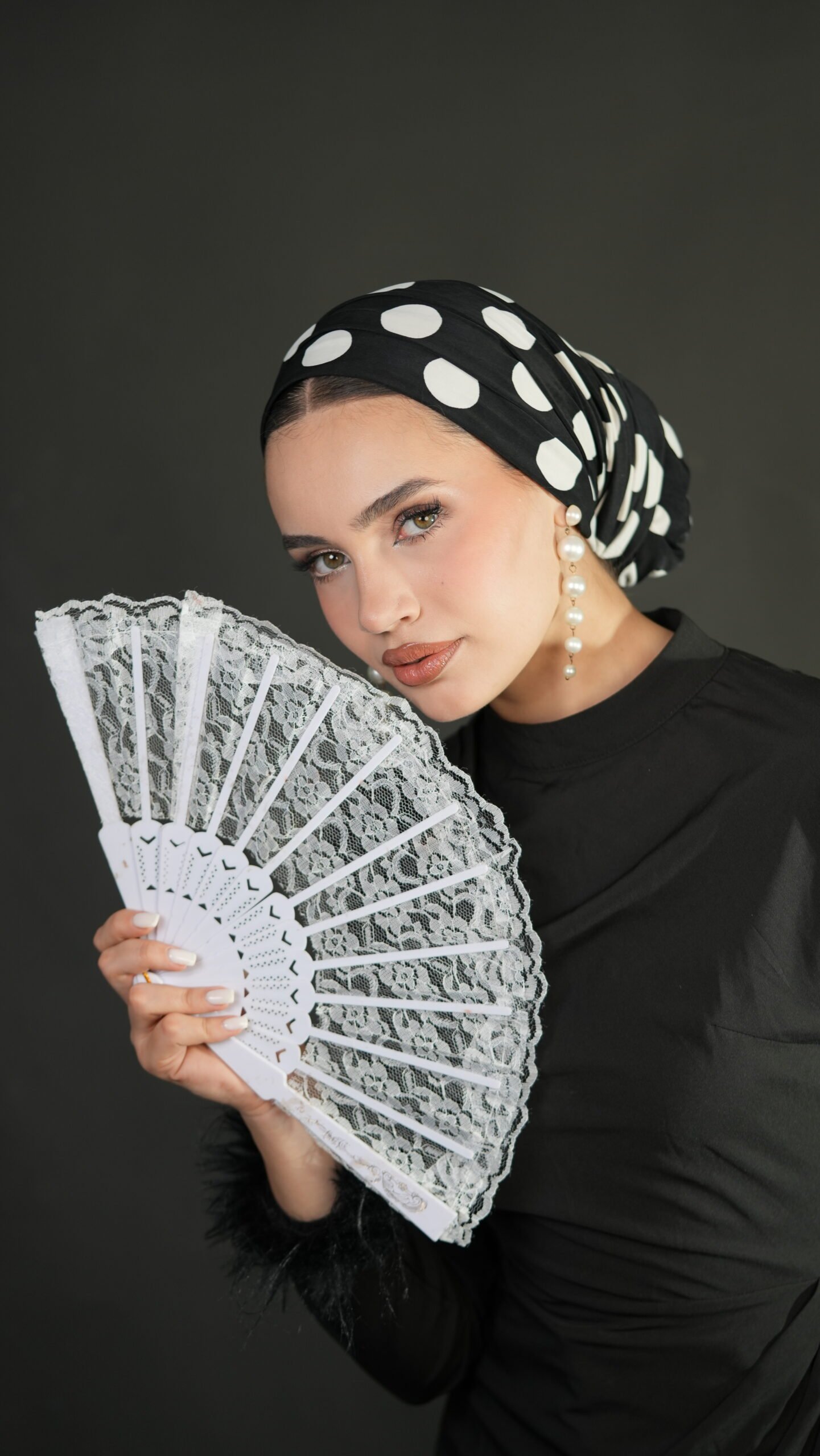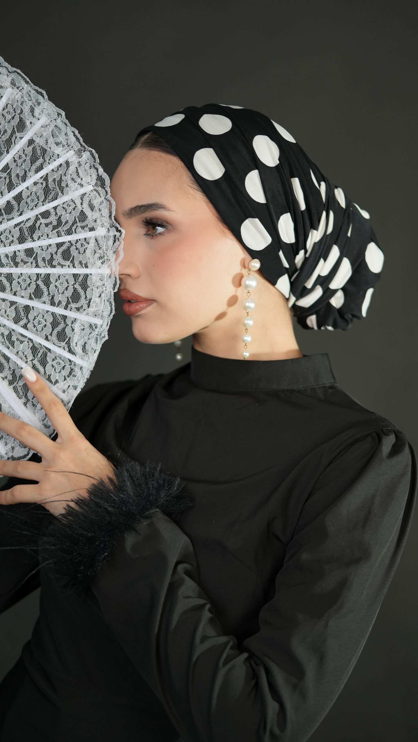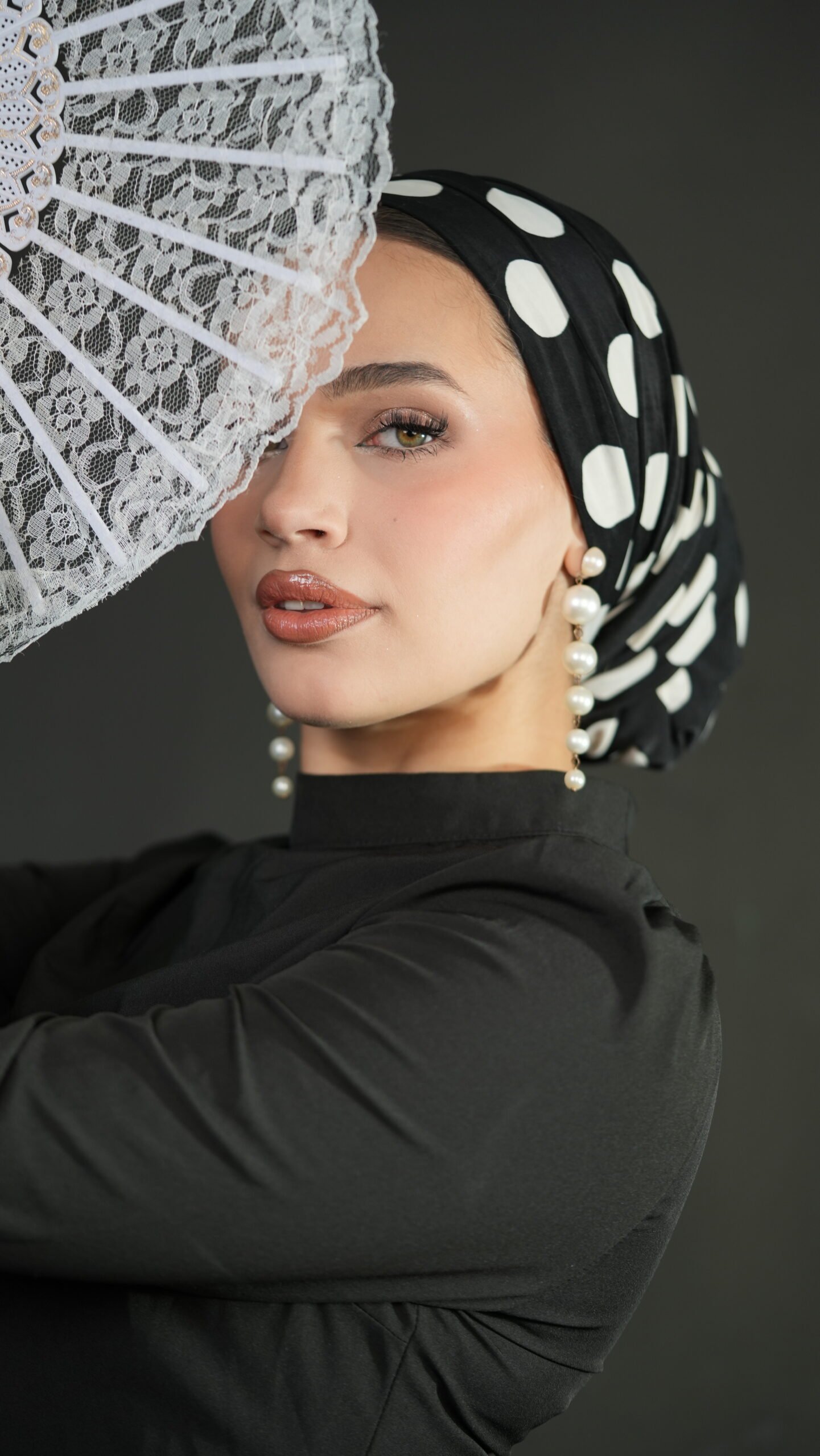 The Classic Polka Drape Bun is a one-piece turban designed with a clean front and a softly wrapped bun at the back. Made from a lightweight, soft fabric, it features a bold black base with crisp white polka dots, creating a timeless and balanced look.