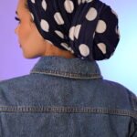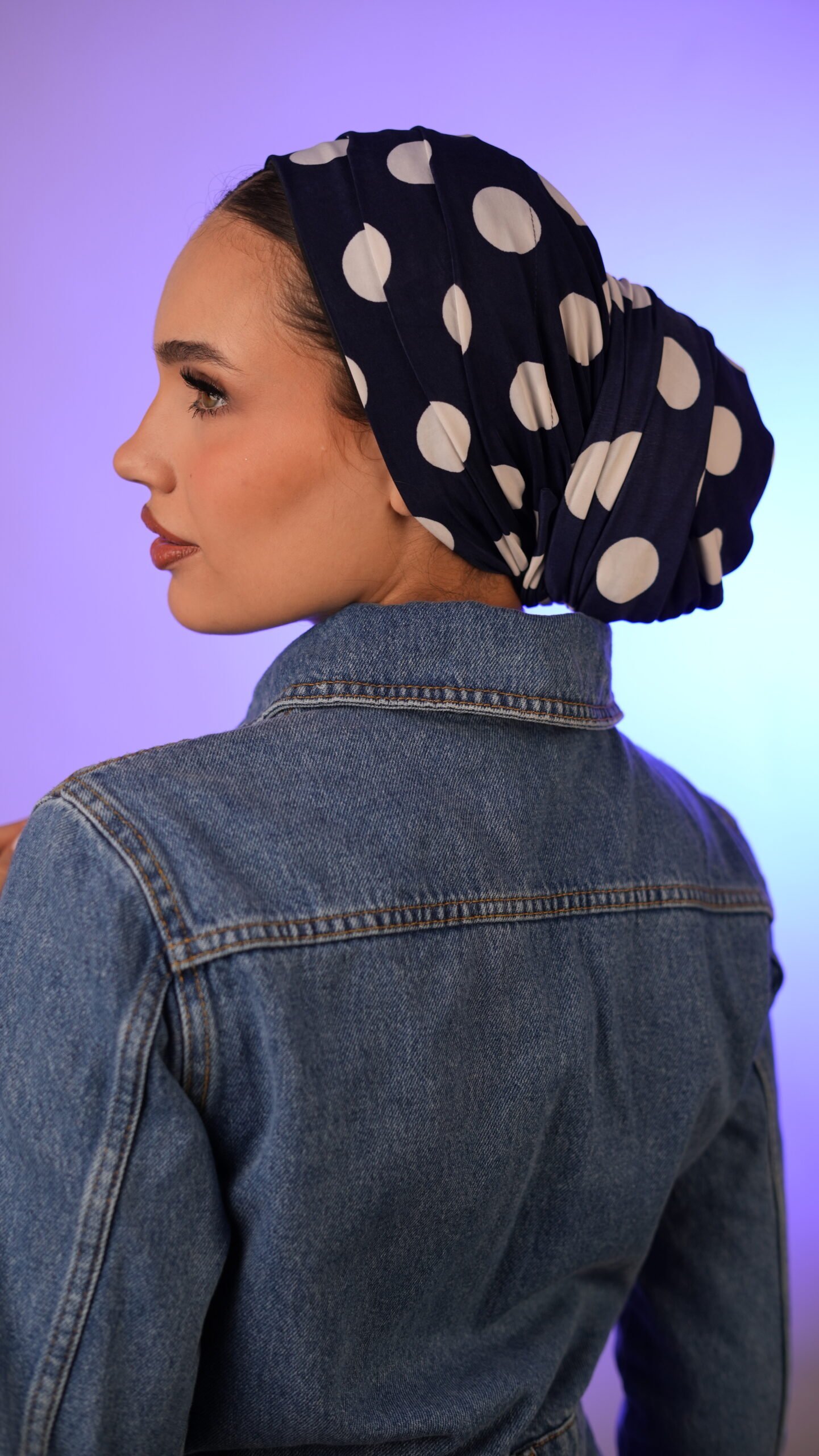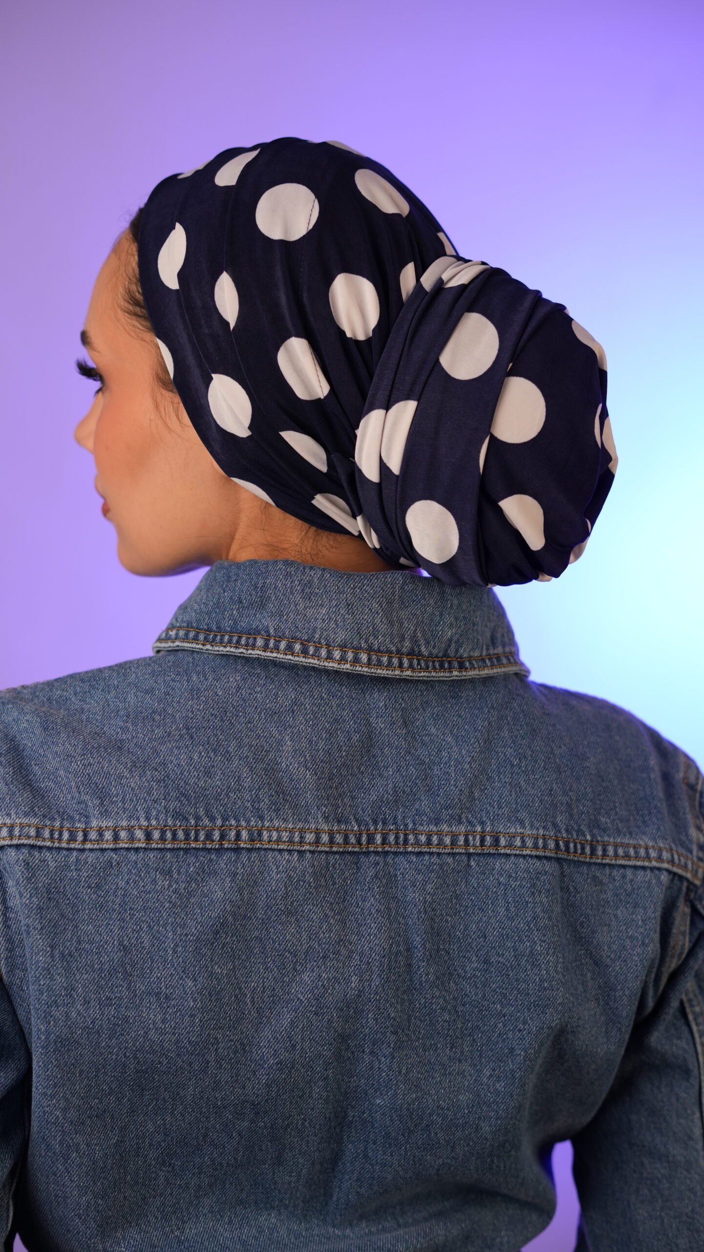 The Classic Polka Drape Bun is a one-piece turban designed with a clean front and a softly wrapped bun at the back. Made from a lightweight, soft fabric, it features a bold navy base with crisp white polka dots, creating a timeless and balanced look.