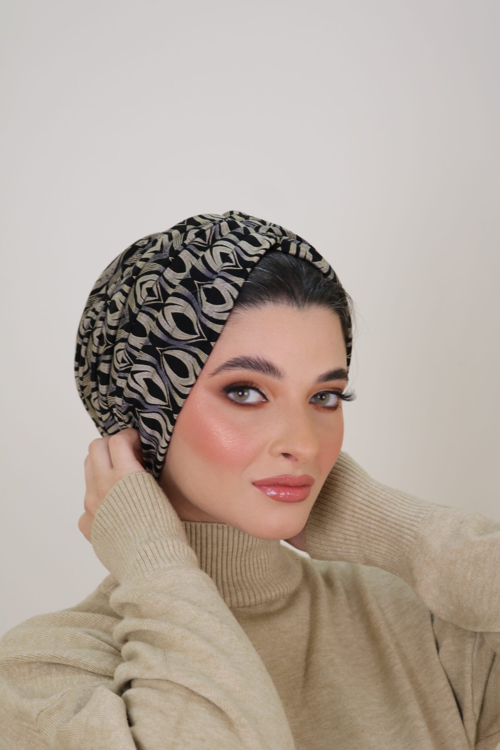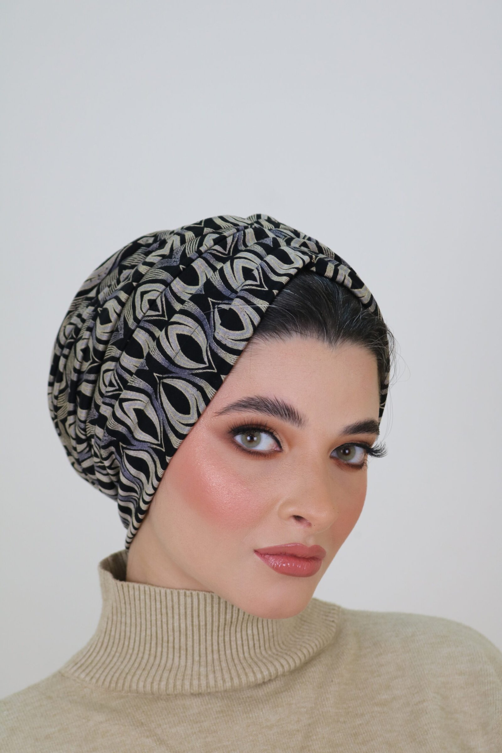 Classic Zam turban made from textured lycra jacquard . Soft, structured, and comfortable, ideal for fall and winter wear