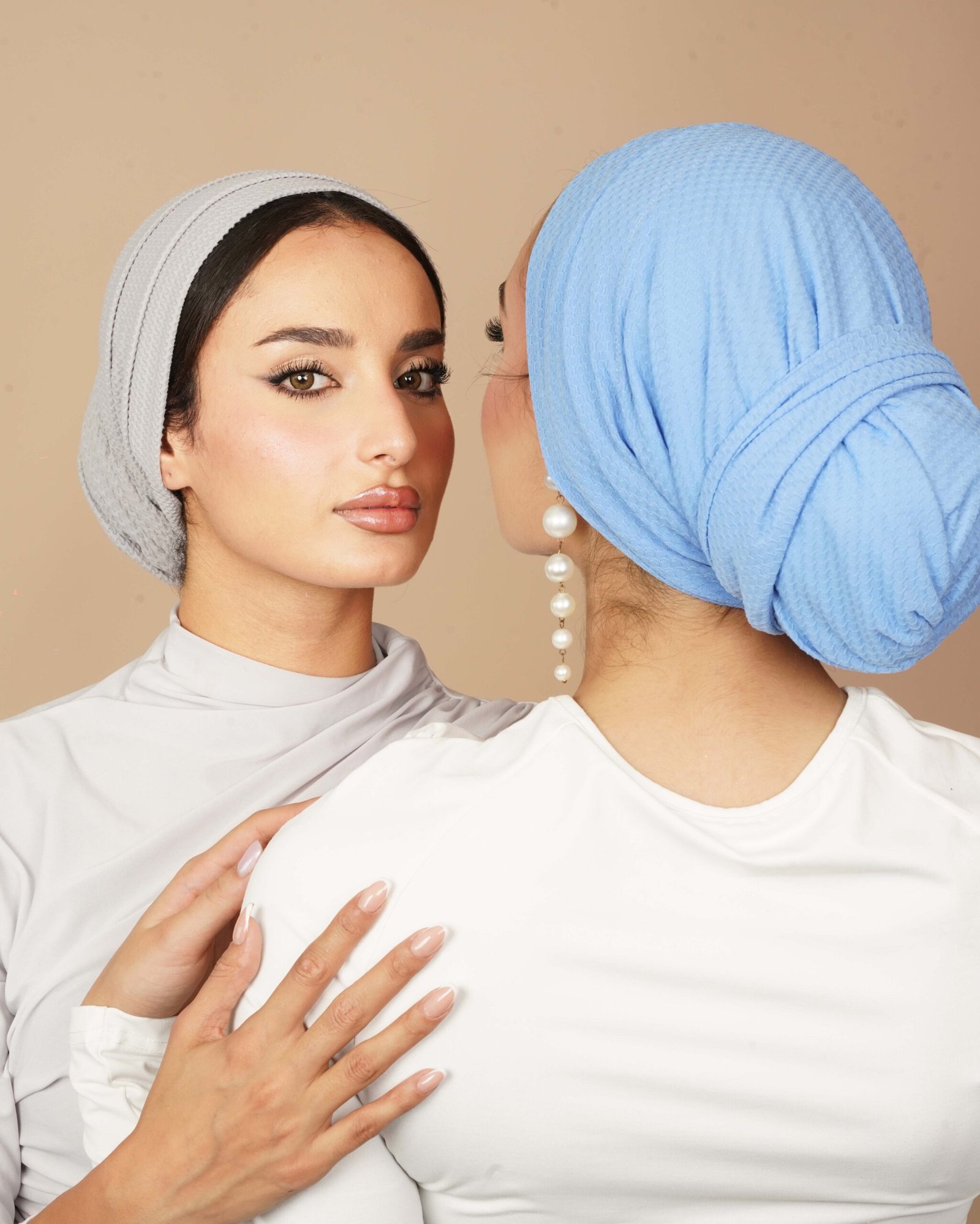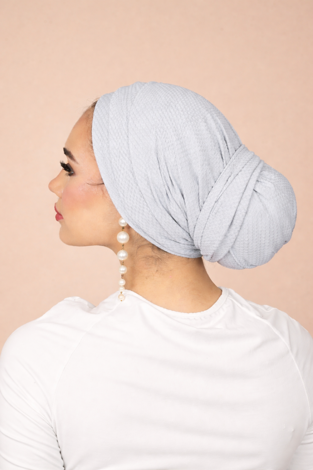The Cloud Grey Drape Bun is a one-piece turban designed with a smooth, clean front and a softly wrapped bun at the back. Made from a waffle-texture fabric, it highlights a defined texture that adds depth and natural volume without feeling heavy.