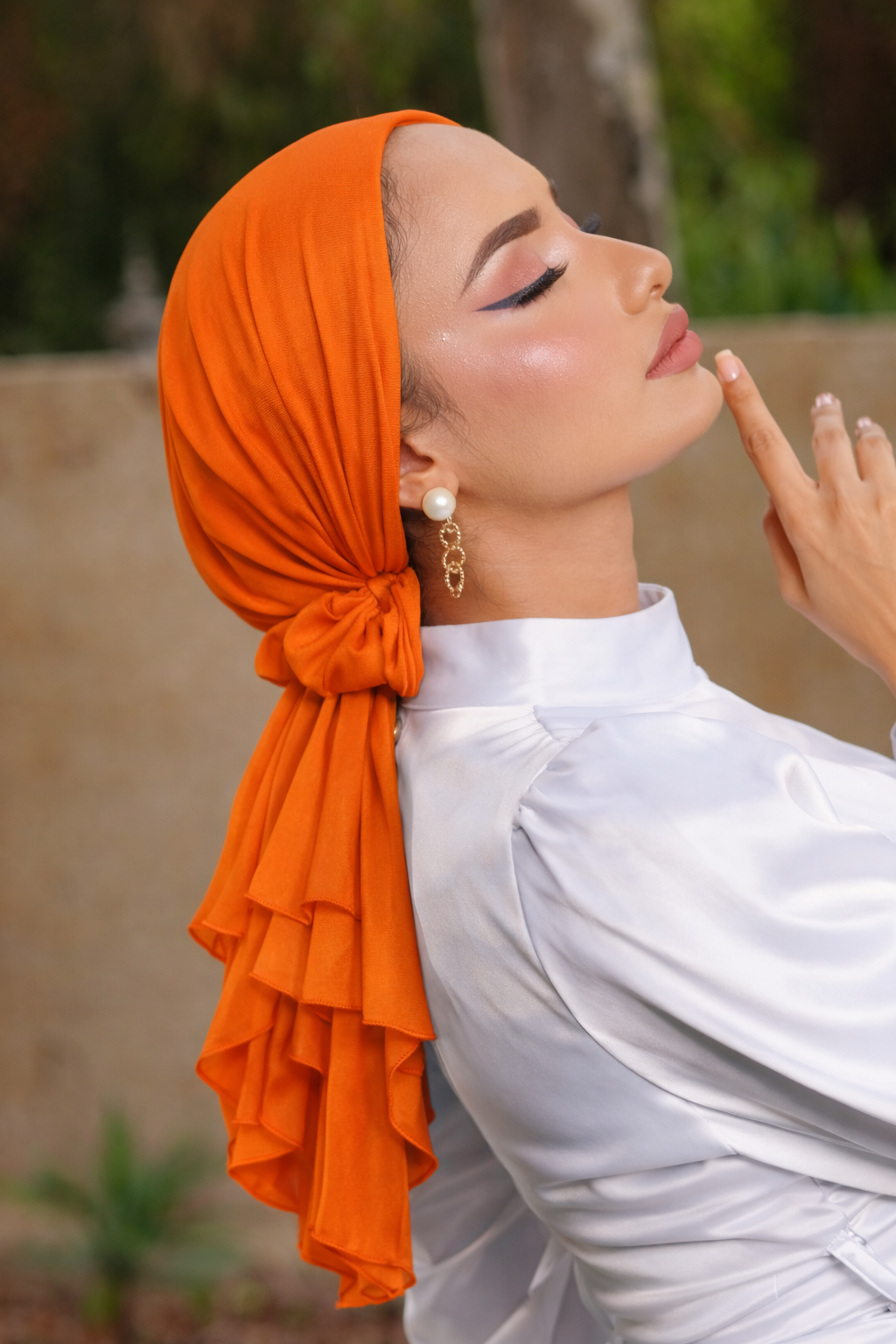 Lightweight chiffon outer layer with a built-in cotton turban inside, finished with a mini tie back for a breathable, comfortable, and secure fit.