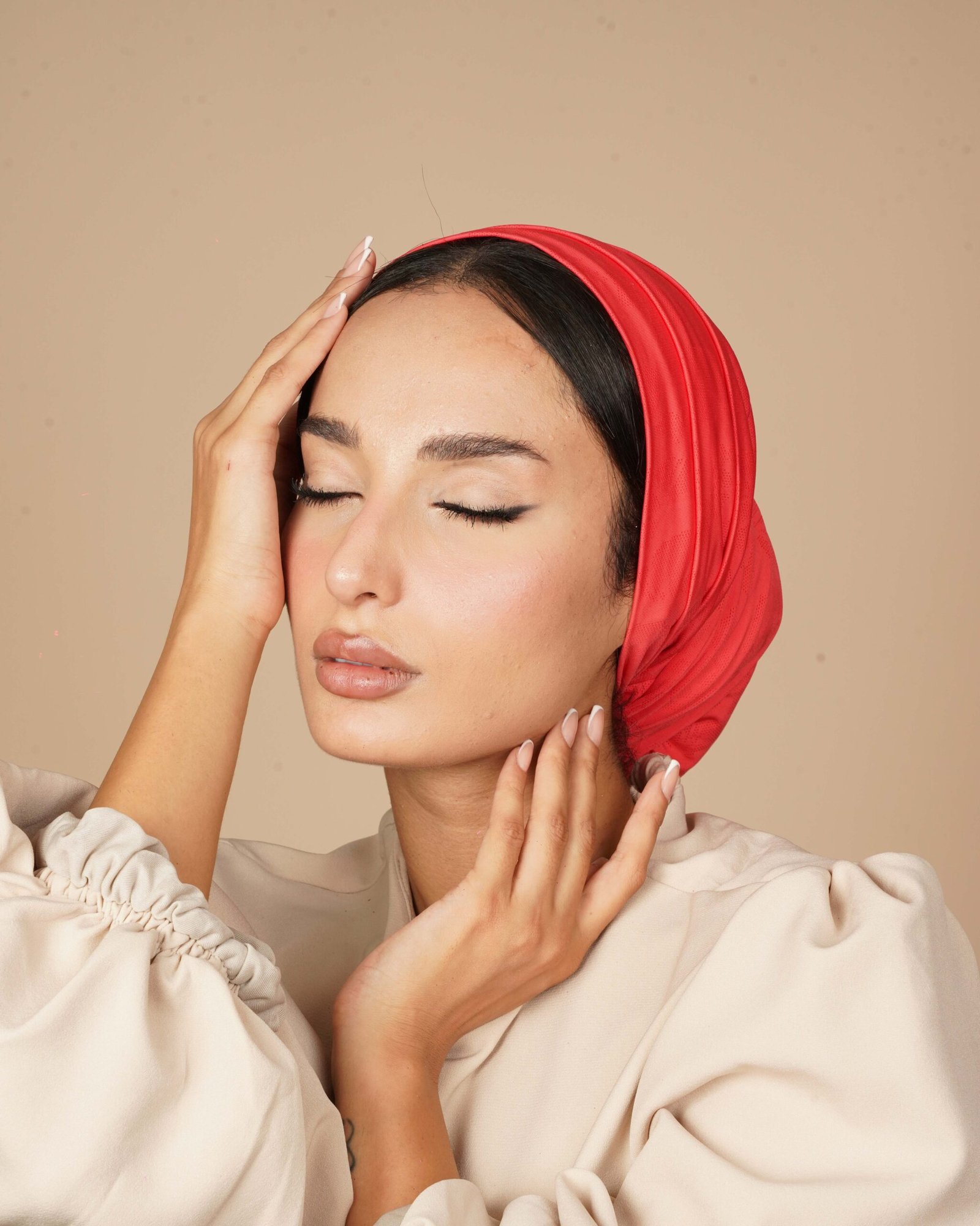 The Coral Red Drape Bun is a one-piece turban designed with a clean front and a softly wrapped bun at the back. Made from a soft textured knit, it offers a smooth finish with gentle fabric grain, giving a fluid and comfortable feel.