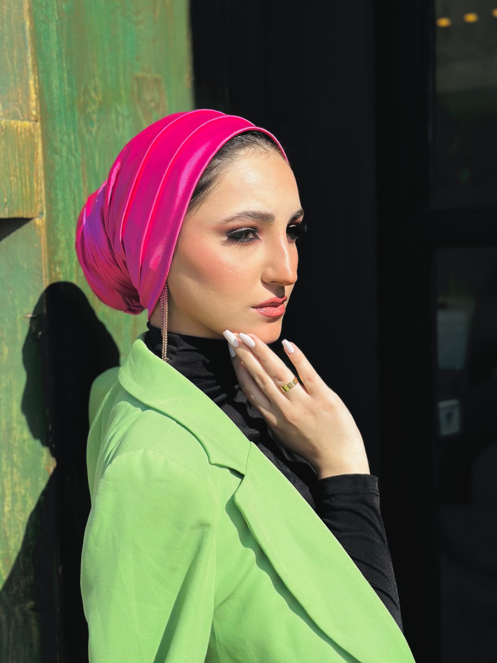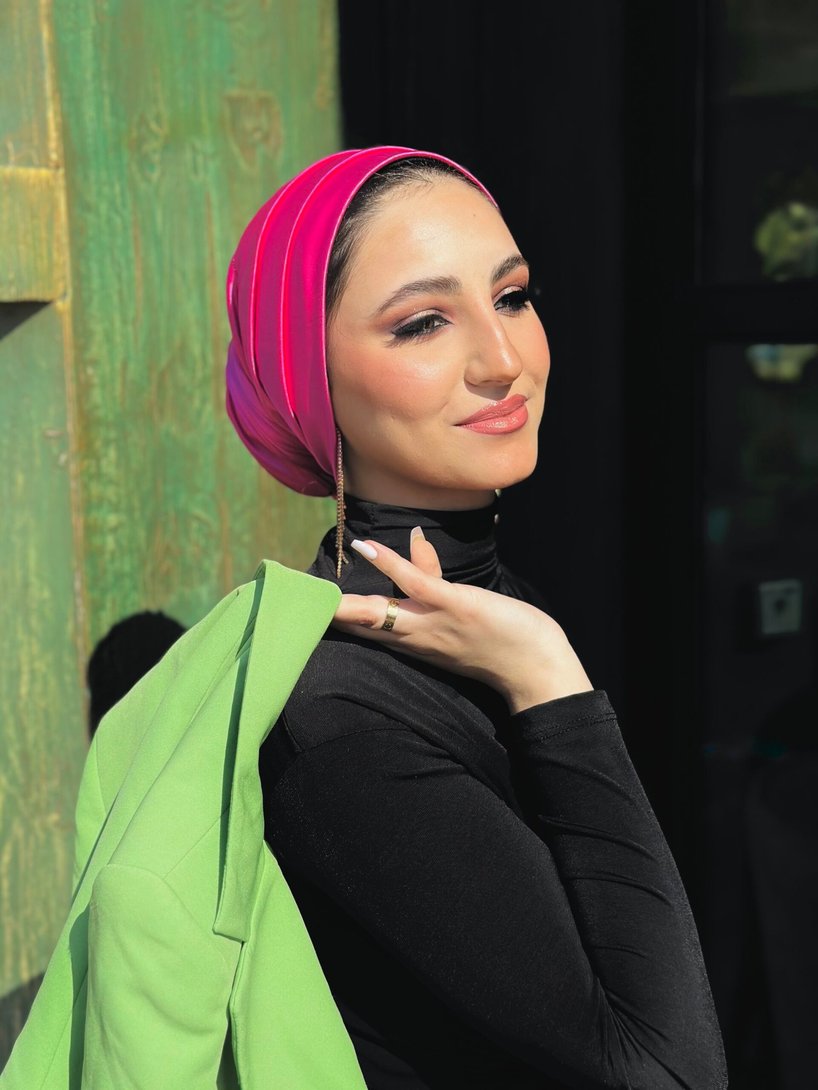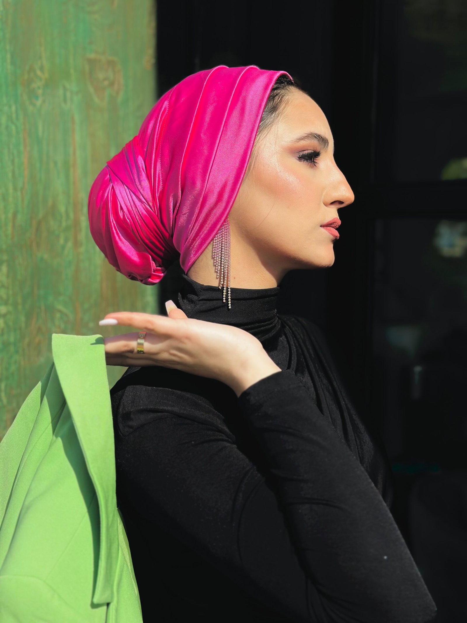 This satin lycra drape bun turban is designed to create a smooth, styled look with a soft, flowing drape at the back. Crafted from satin-finish lycra, it combines gentle shine with stretch comfort, allowing the turban to sit securely while maintaining a refined appearance.