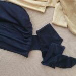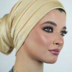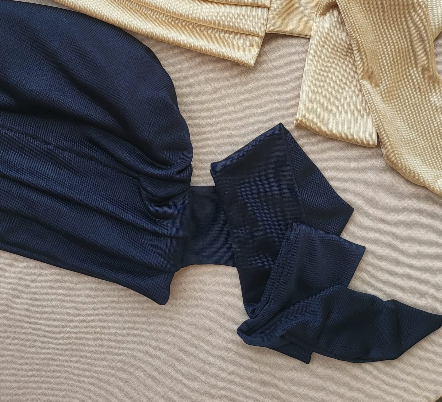 This gold shimmer lycra turban is designed with a clean, layered front that creates a smooth and structured finish on the head. Made from soft stretch lycra with a subtle sheen, it offers comfortable wear while holding its shape beautifully.