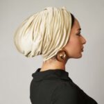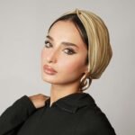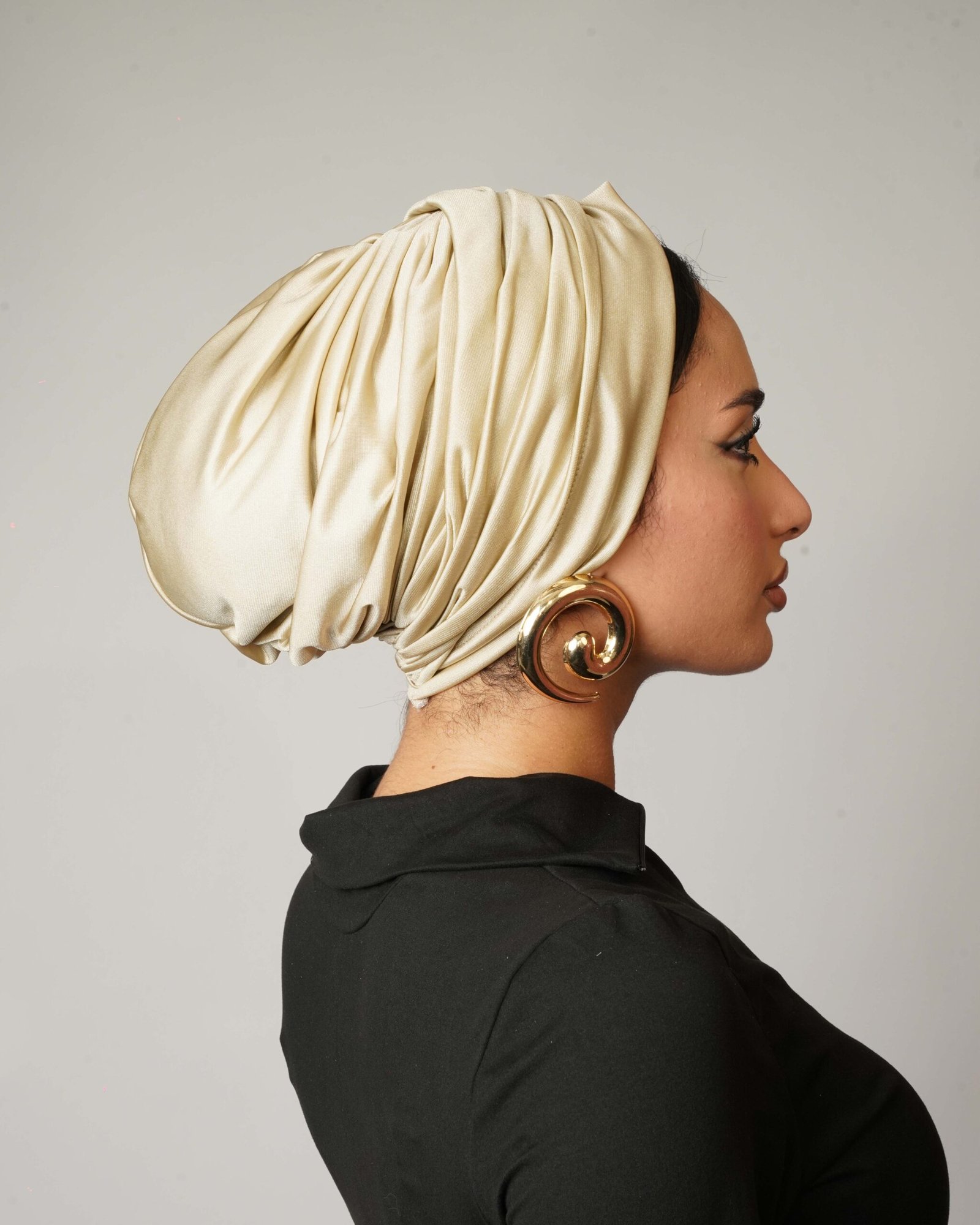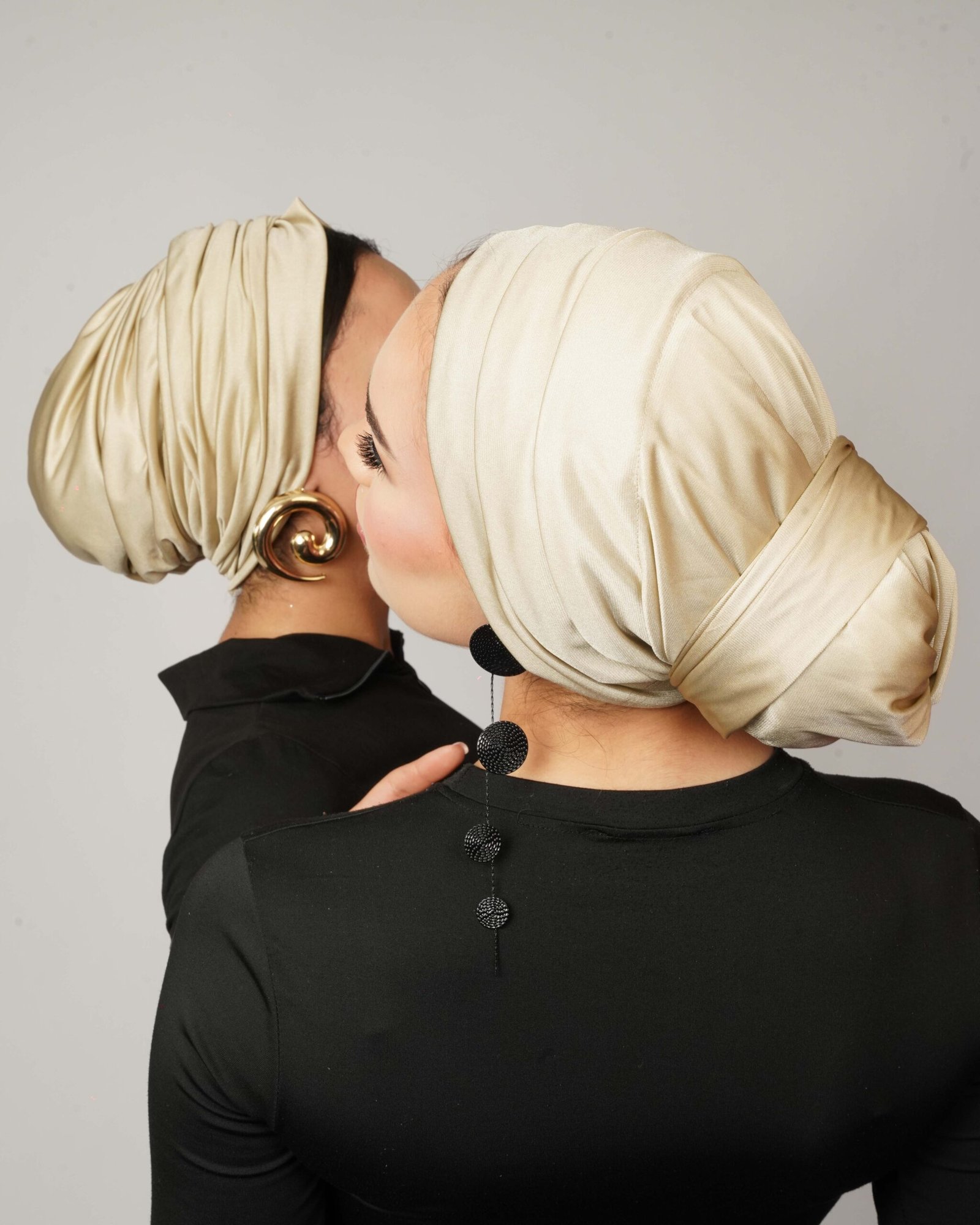 The  Gold Zam Drape is a refined two-piece turban design, with both pieces linked from the back to create a secure and effortless fit. The inner piece forms a smooth base, while the outer piece drapes softly in the front, creating fluid folds that frame the face naturally.