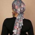 Satin silk mini tie turban with a grey paisley print, featuring a built-in inner cotton turban and a mini tie back for a smooth, comfortable, and secure fit