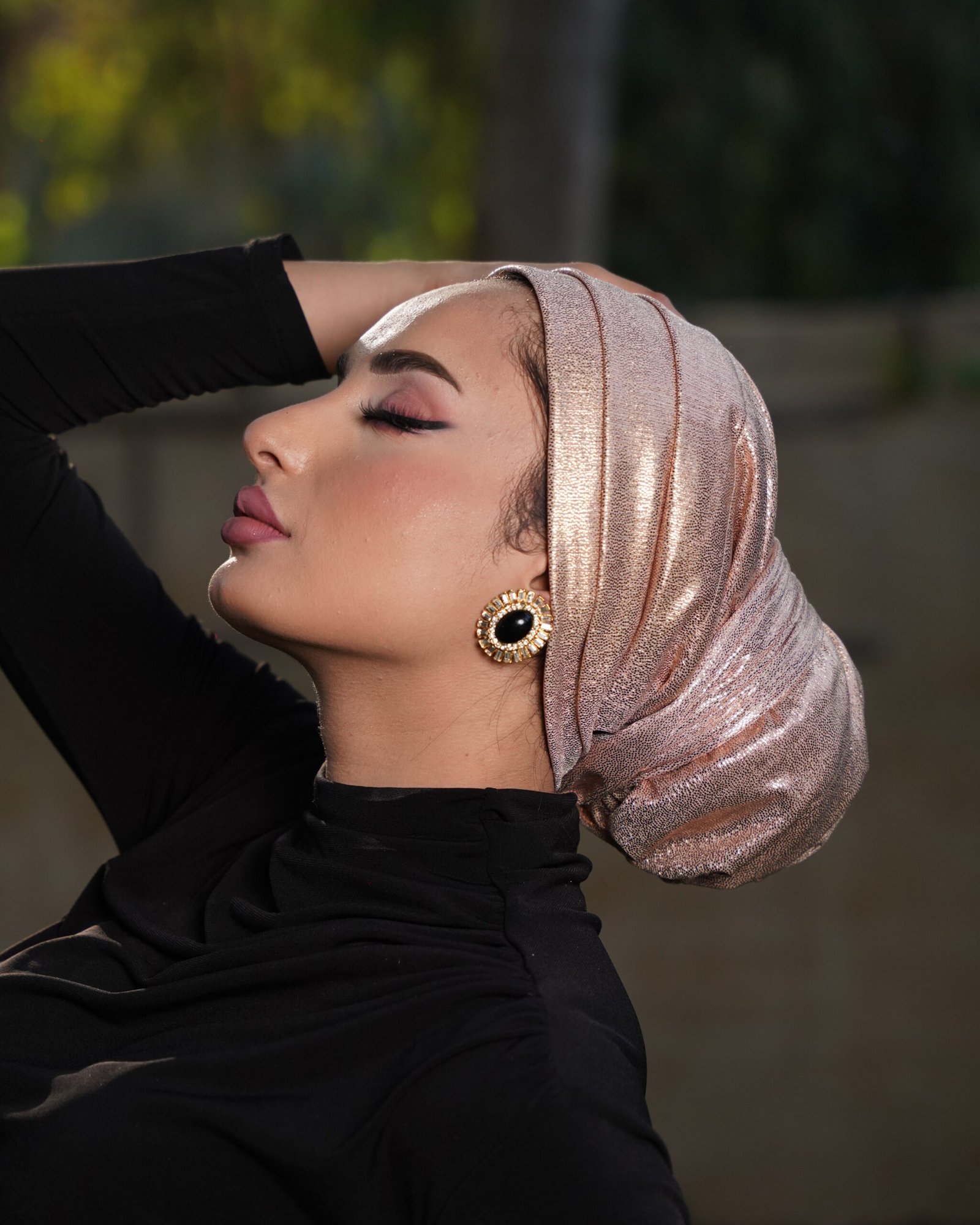 The Lamé Drape Bun Turban is designed to bring a soft glow and refined structure to your look. Crafted from lightweight lycra lamé fabric, it features a subtle shimmer with a smooth, fluid drape that catches the light beautifully without feeling heavy.