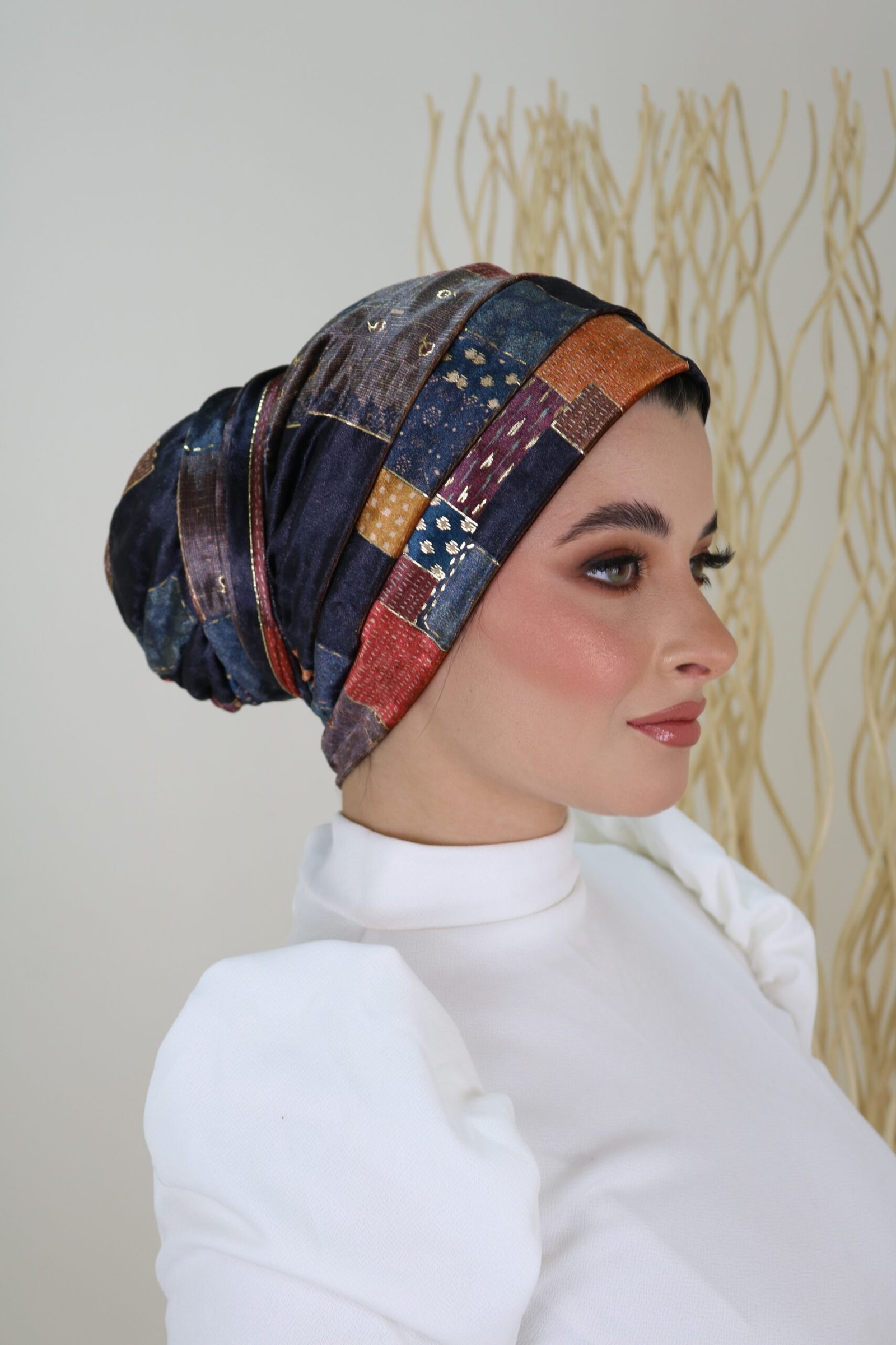 Drape Bun turban made from soft printed velvet. Rich in texture, comfortable, and ideal for fall and winter wear.