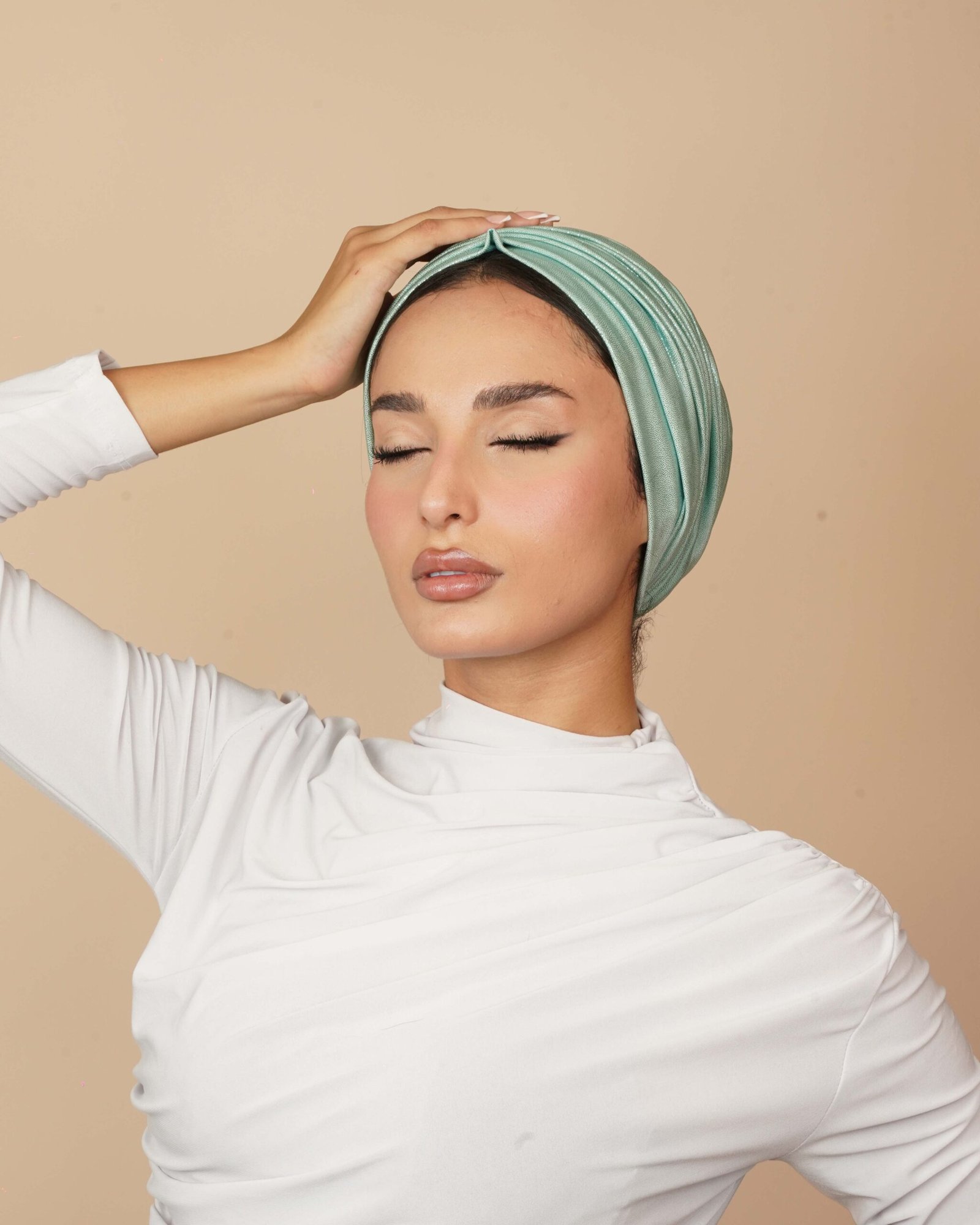 Zam Drape Lamé is a two-piece turban design created for a refined, polished look with a soft front drape. It features an inner base for secure wear, paired with an outer lamé layer that flows naturally from the back to the front, forming a graceful draped effect.