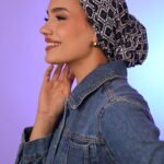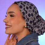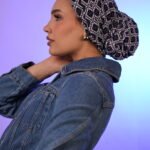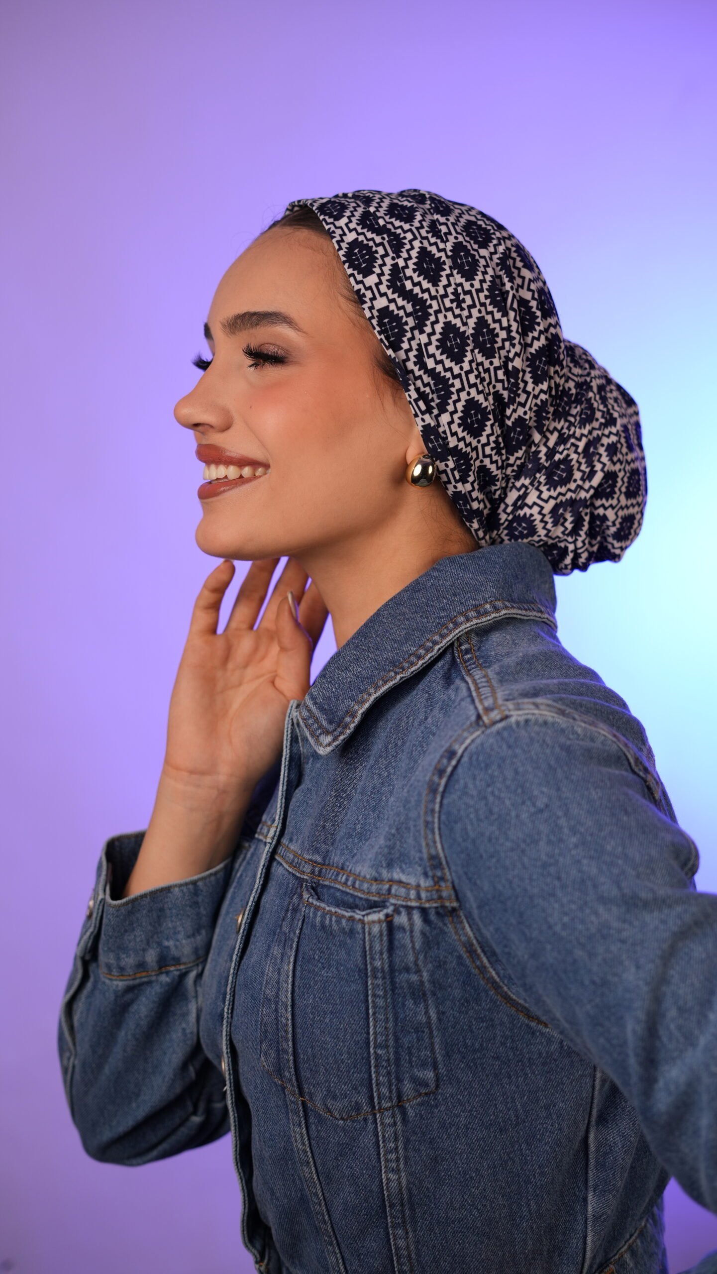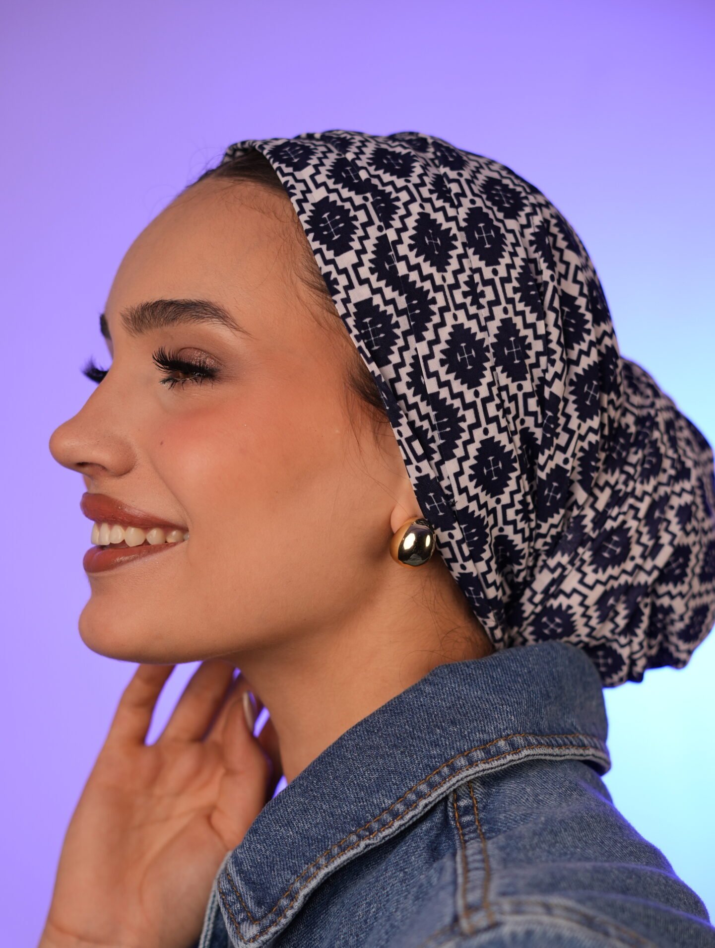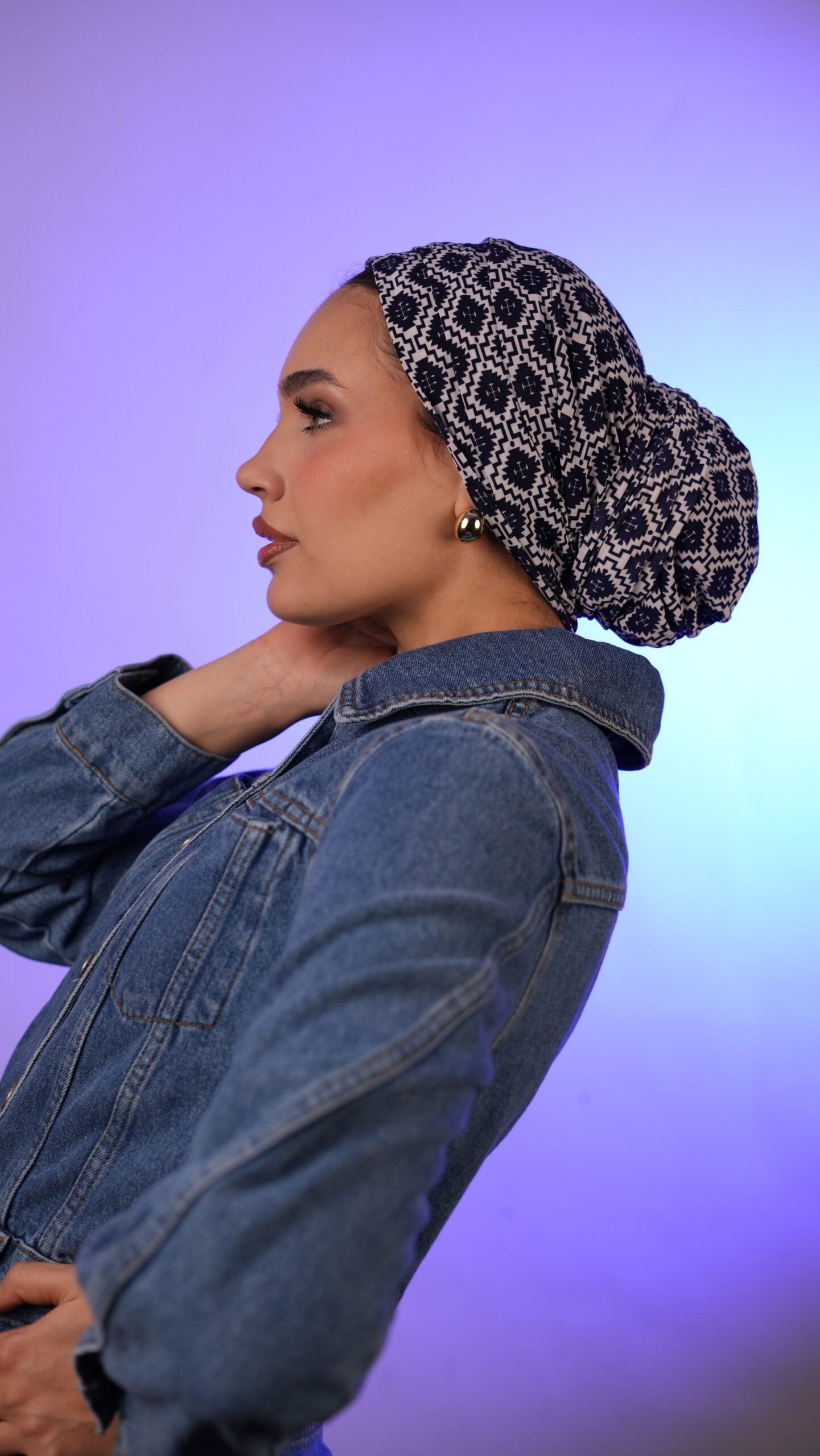The Mono Geo Drape Bun is a one-piece turban designed with a clean front and a softly wrapped bun at the back. Made from a lightweight, soft fabric, it features a bold navy and white geometric print that creates a sharp, modern look.