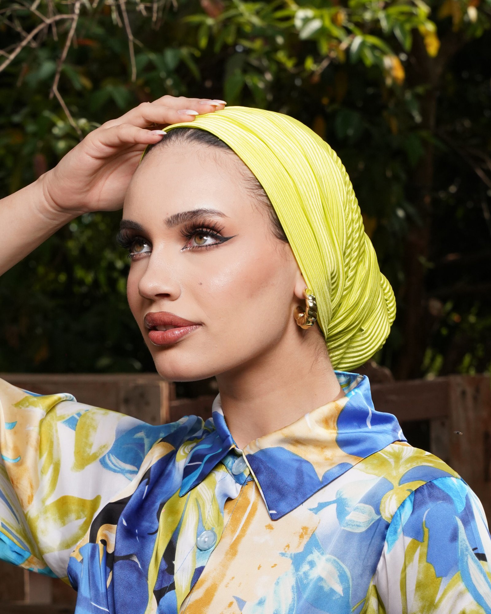 This plissé satin drape bun turban is designed with fine pleated detailing that adds texture and depth to the look. Crafted from satin-finish lycra, it combines a soft sheen with stretch comfort, allowing the turban to sit securely while maintaining a smooth, styled appearance.