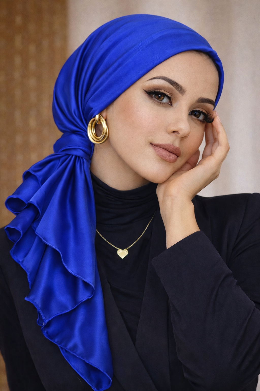 The mini tie detail is connected with a soft scrunchy, allowing the turban to sit perfectly without slipping or tightening. It creates a graceful drape at the back while keeping the front clean and structured.