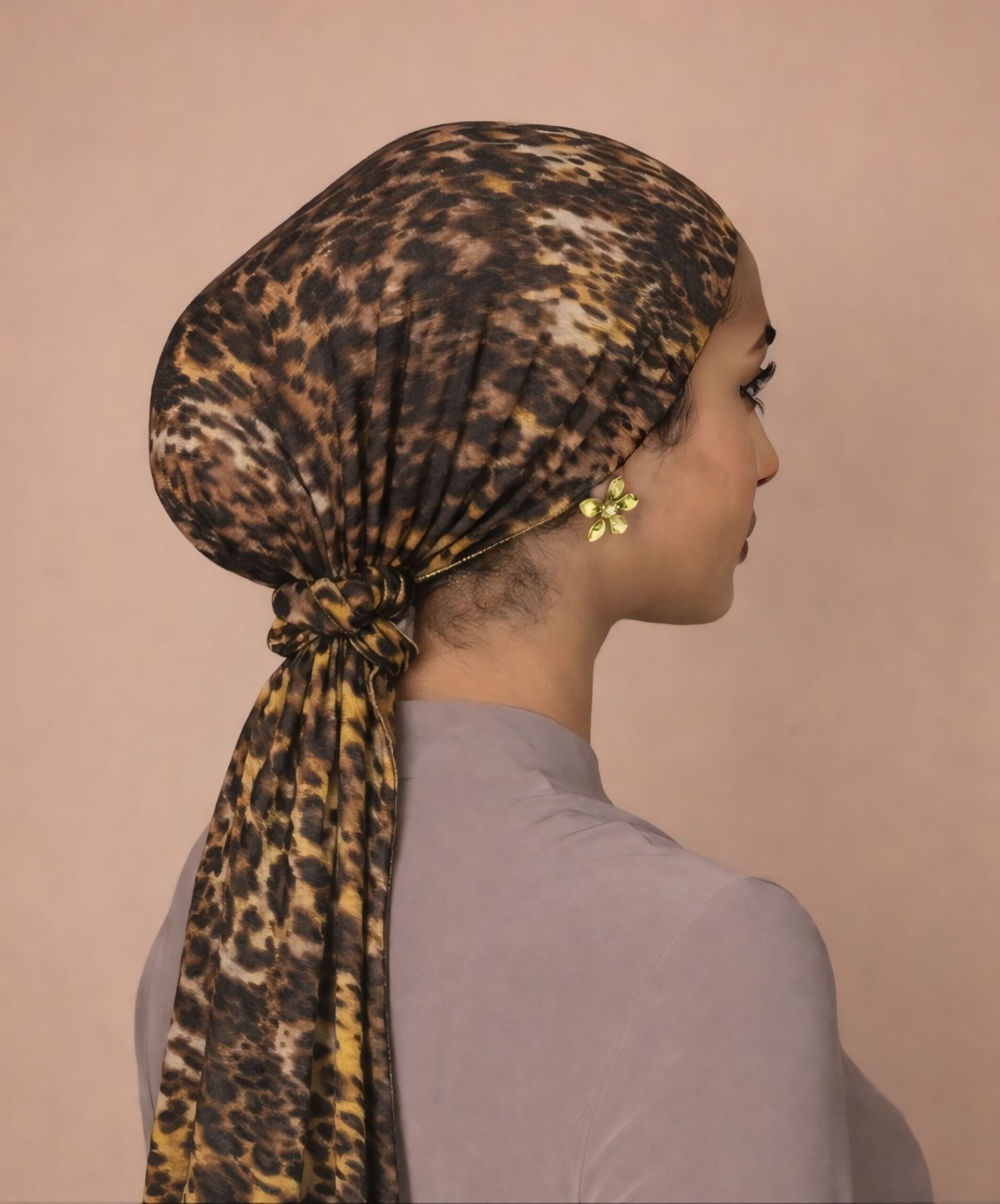 Designed for comfort with a bold edge, this printed mini tie turban is made from a light, stretchy lycra fabric that offers a smooth fit and flexible wear. The fabric adapts comfortably to the head, providing ease of movement and secure coverage without pressure.