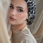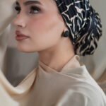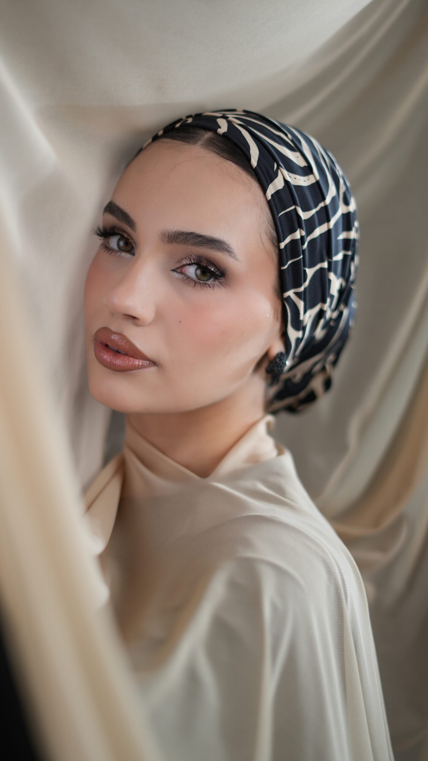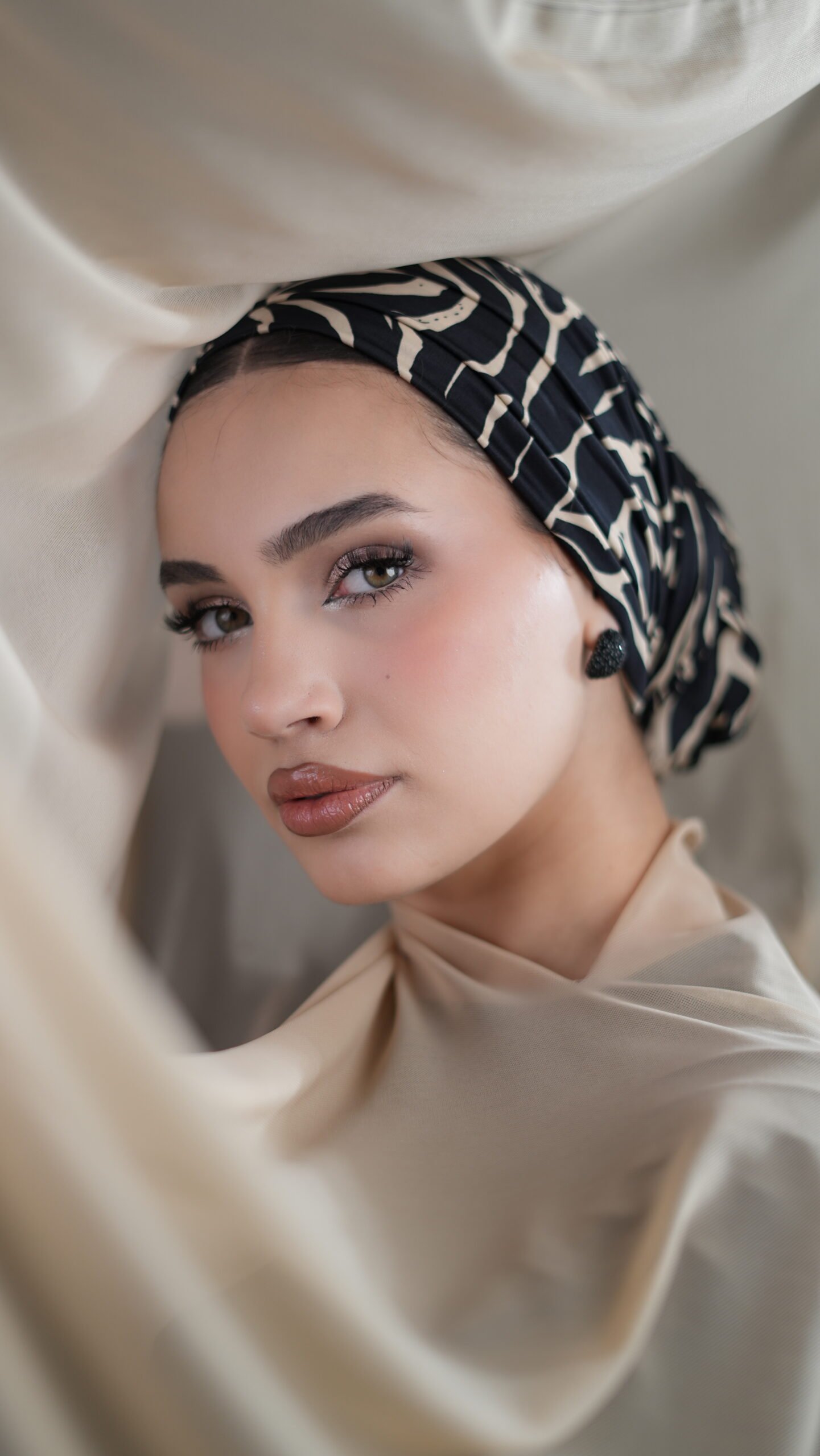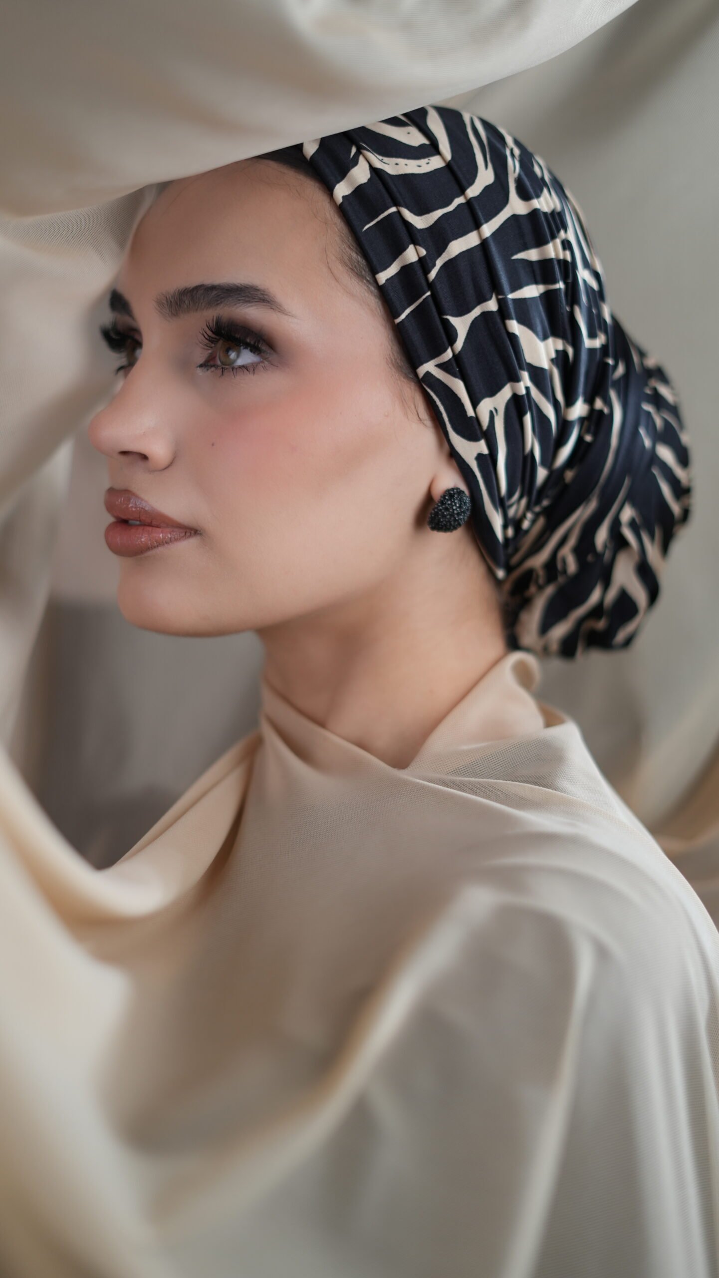 The Vanessa Flow Drape Bun is a one-piece turban crafted from soft Venesa jersey, designed with a clean front and a softly wrapped bun at the back. The fabric features a fluid abstract print in deep black with warm beige strokes, creating a smooth, natural movement across the surface.