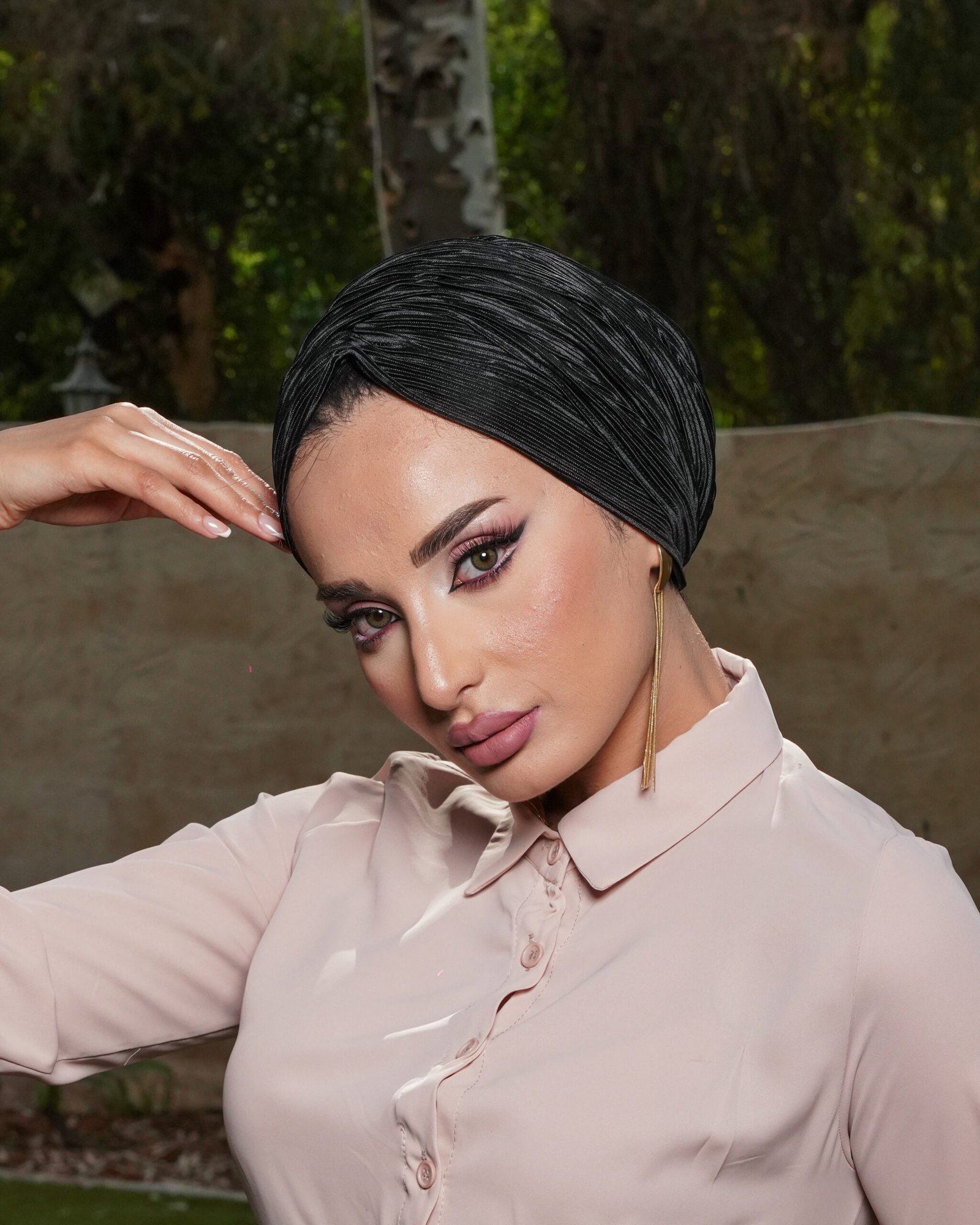 Satin Plissé Zam Drape is a two-piece turban linked from the back, featuring a smooth inner base and a loose front drape with soft pleated folds. Lightweight and comfortable, with a subtle satin sheen that adds depth and texture.