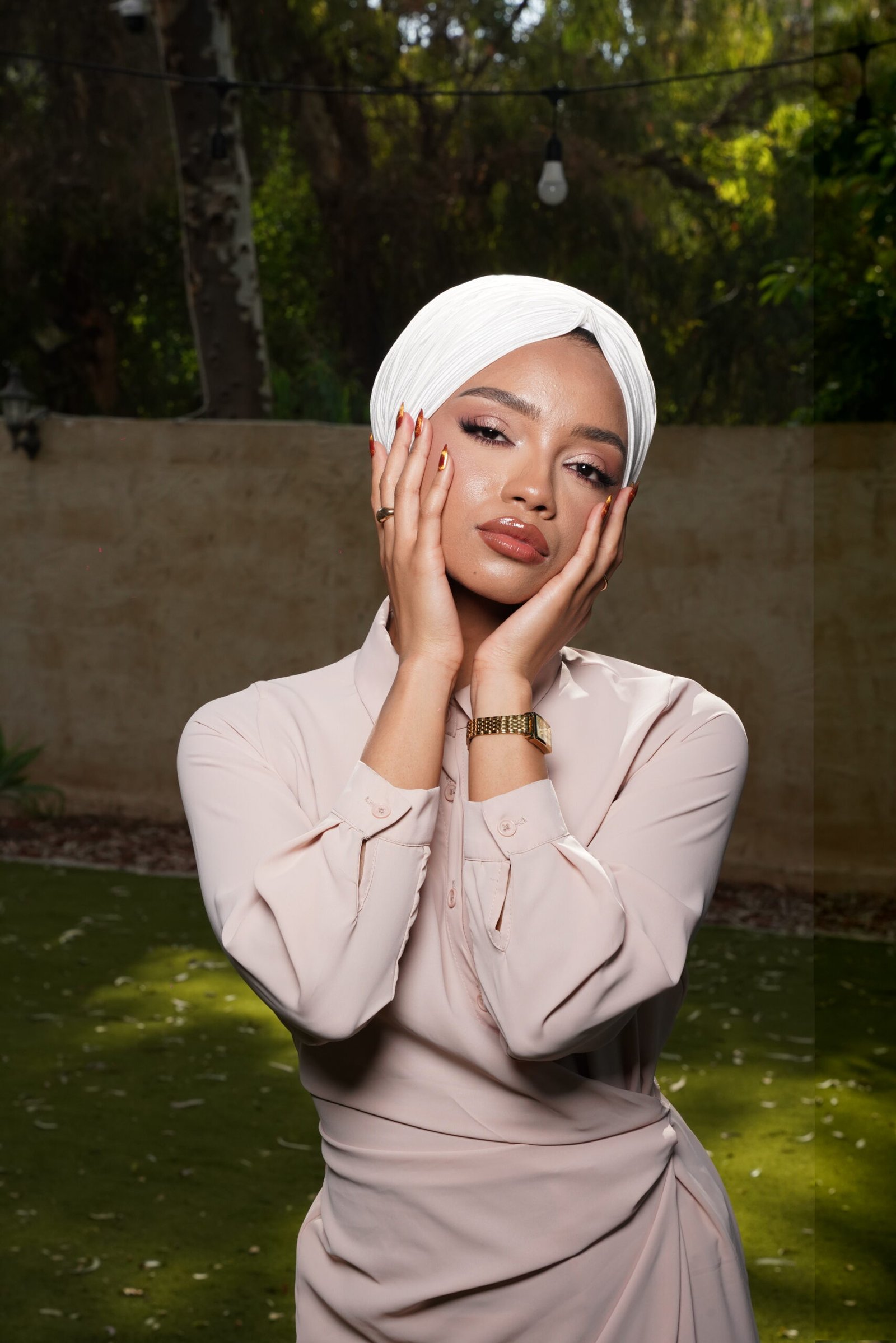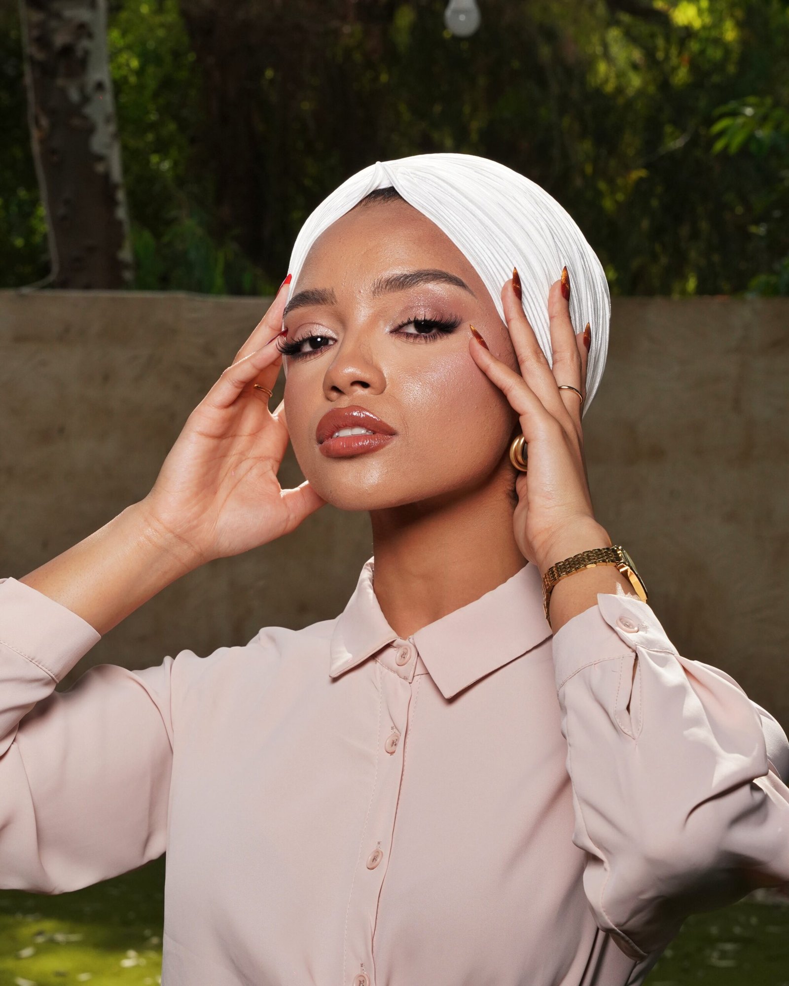 Satin Plissé Zam Drape is a two-piece turban linked from the back, featuring a smooth inner base and a loose front drape with soft pleated folds. Lightweight and comfortable, with a subtle satin sheen that adds depth and texture.